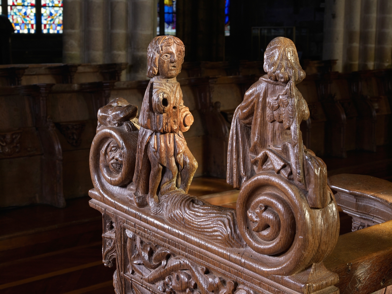 Rangs sud, détail de l'intérieur de la jouée des stalles basses, personnages sculptésImmatriculation