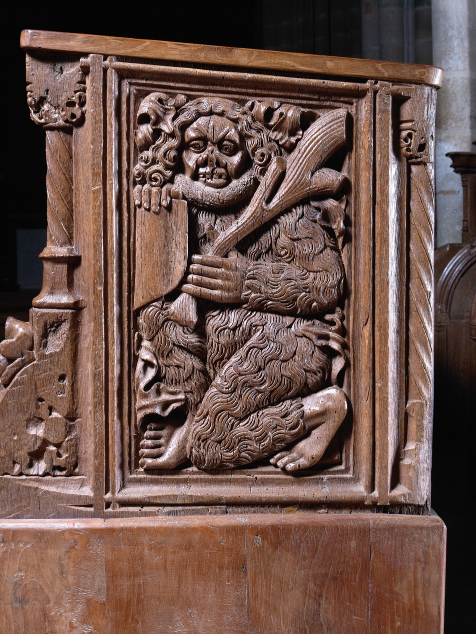 Rangs nord, détail de la jouée est des stalles basses, représentation de l'homme sauvage portant des armoiriesImmatriculation
