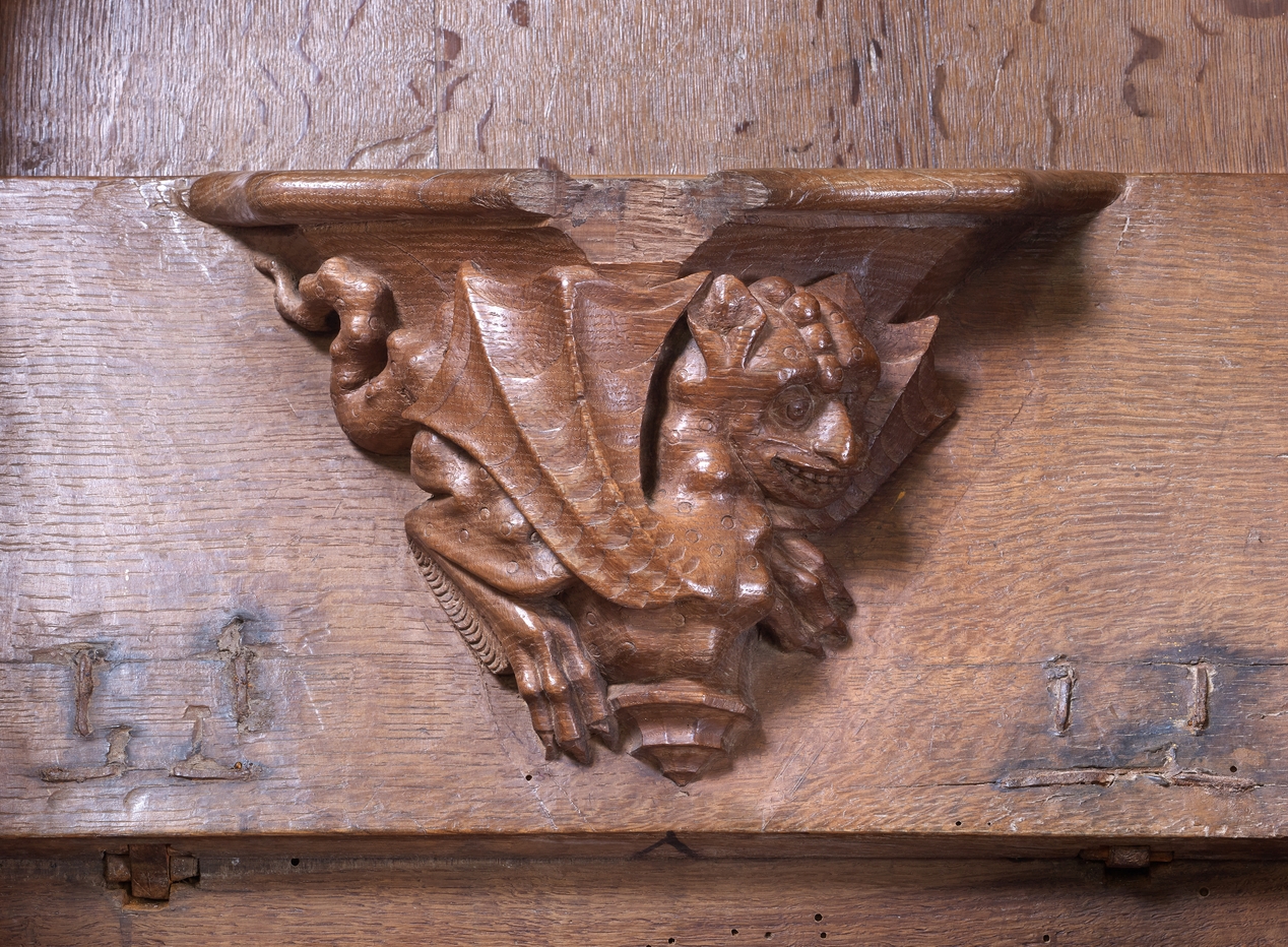 Détail de l'une des stalles : un dragon ailéImmatriculation