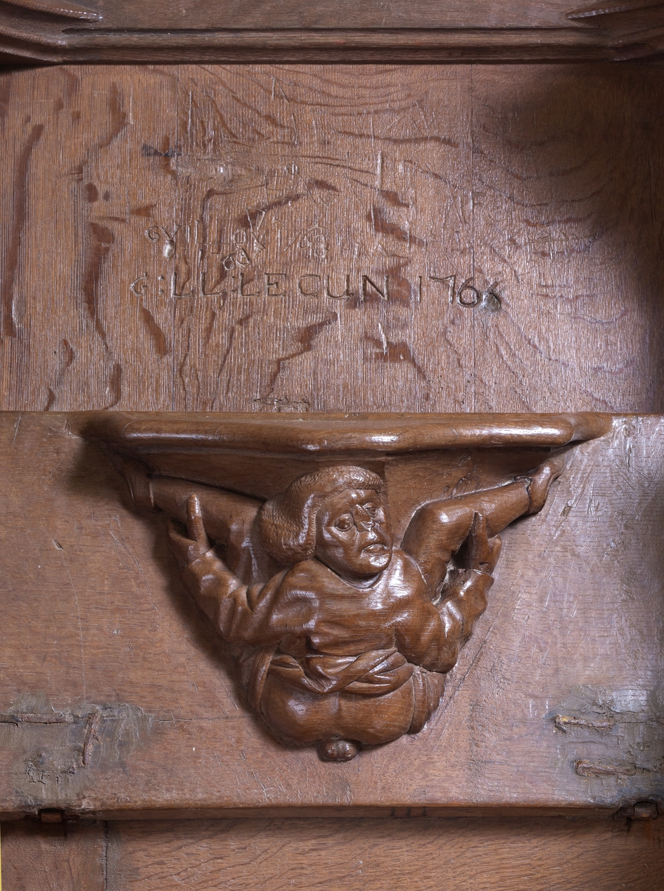 Détail de l'une des stalles : un acrobate exhibitionnisteImmatriculation