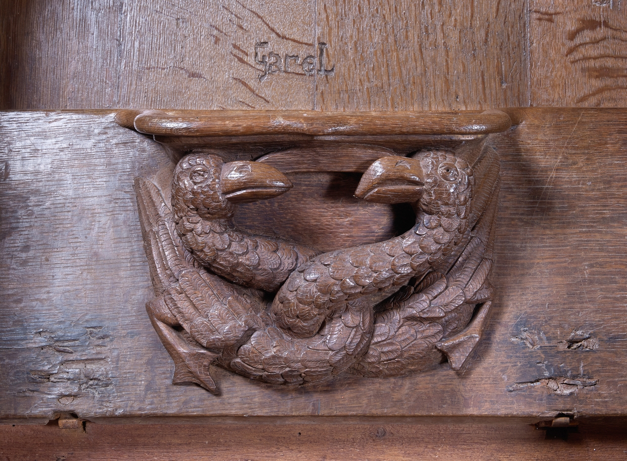 Détail de l'une des stalles : deux oiseaux ou hydreImmatriculation
