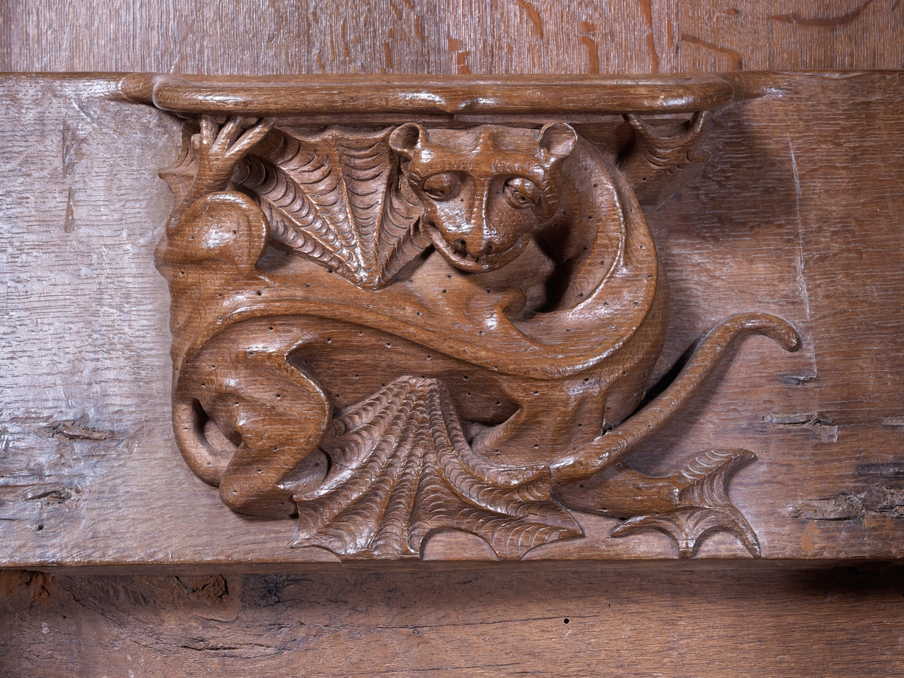 Détail de l'une des stalles : un dragon ailéImmatriculation