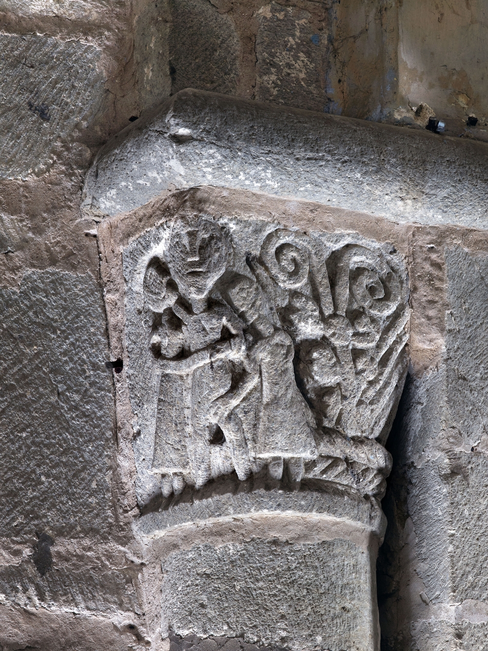 Détail d'un des chapiteaux sculptés : il s'agit de trois personnages dans un décor végétal, un homme et une femme qui porte la main sur son ventre, encadrant un grand personnage. Il pourrait s’agir d’une scène de mariageImmatriculation