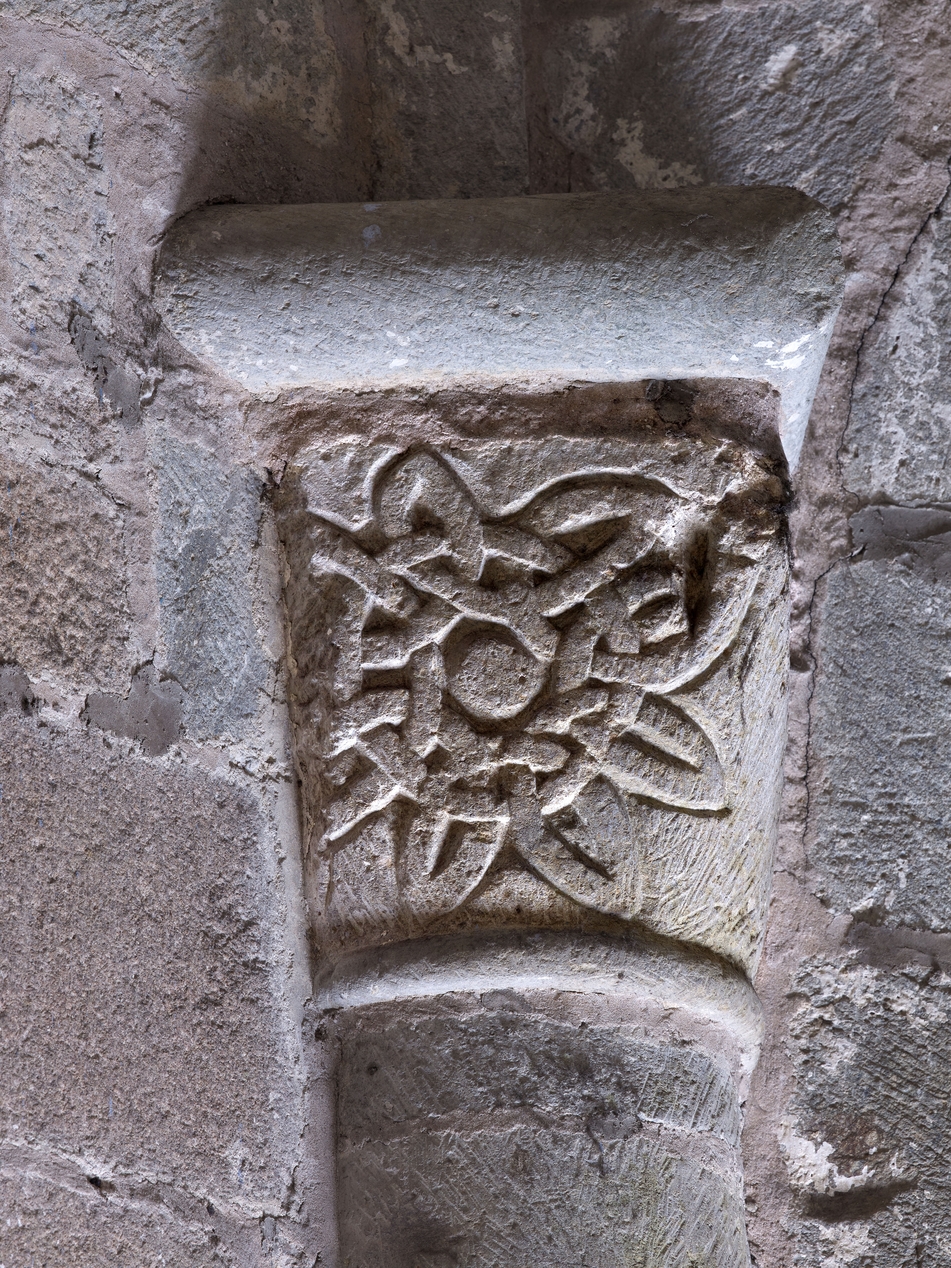 Détail d'un chapiteau sculpté d’entrelacs (soleil : ?)Immatriculation