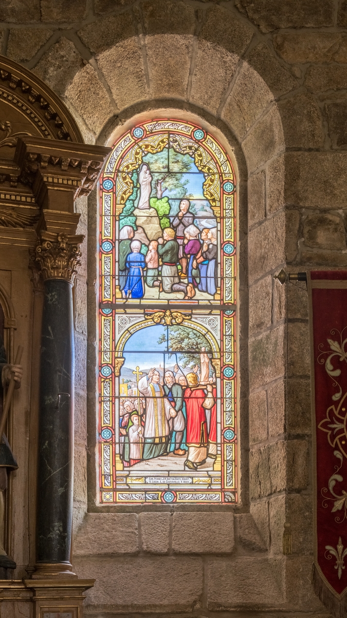 Ensemble de 8 verrières à personnages des baies 1 à 8 : Miracles de Notre-Dame du Guiaudet,