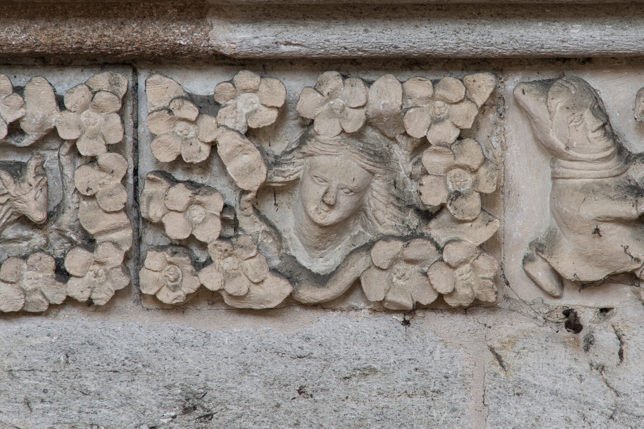 Détail de la frise sculptée en calcaire soulignant le triforiumImmatriculation