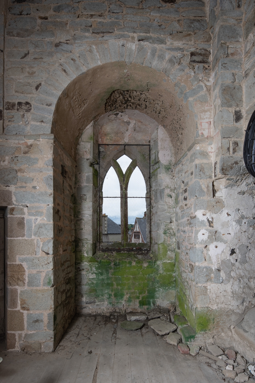 Deuxième niveau de la tour Hasting, élévation est, baie à remplage gothique en Y. A droite sur la voûte, on peut observer les vestiges d'un enduit en faux appareilImmatriculation