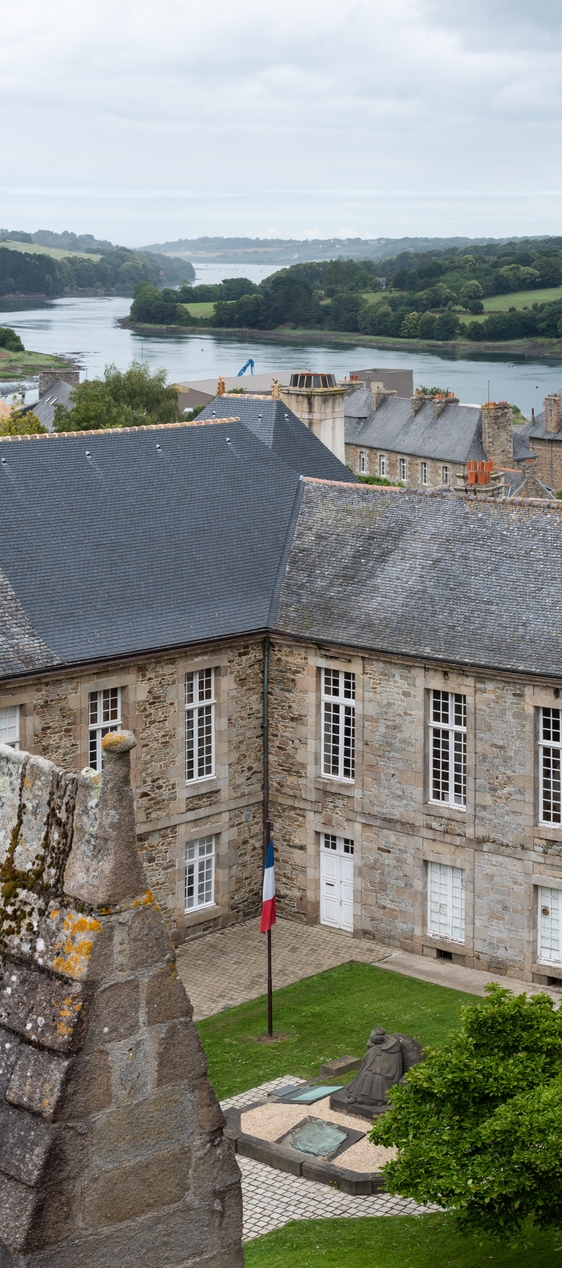 Corps principal du palais et de l'aile sud, détail de l'élévation sud depuis la cathédrale Saint-Tugdual. En arrière-plan, la rivière de TréguierImmatriculation