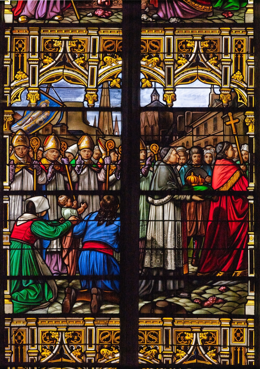Détail de la verrière du couronnement de la Vierge en 1857 : les couronnes sont portées en procession par les ecclésiastiques à GuinguampImmatriculation