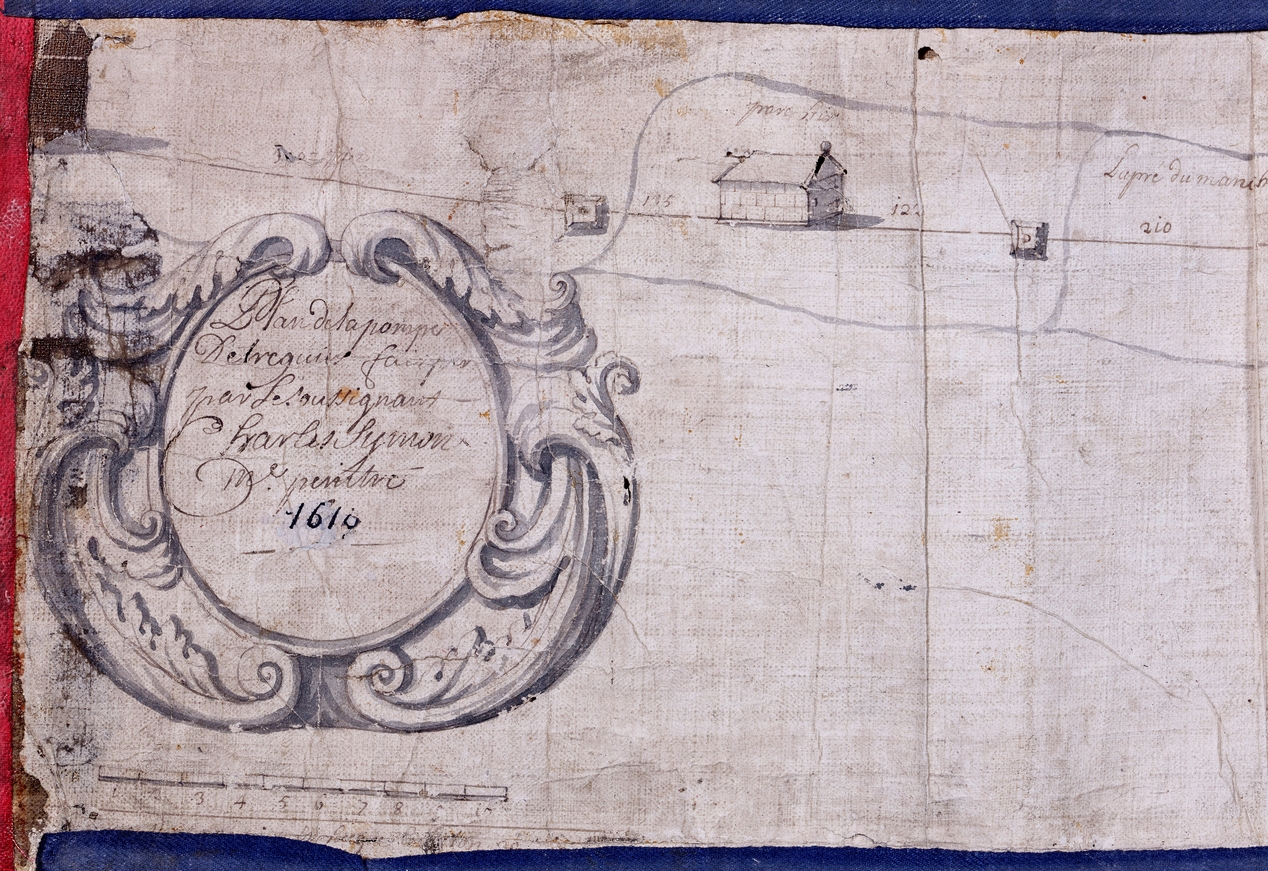 Détail du plan de la conduite d'eau de la ville de Tréguier par Charles Symon, maître peintre, 1610, cartouche orné de feuilles d'acanthe (Archives communales de Tréguier de Tréguier, 1Fi8)Immatriculation