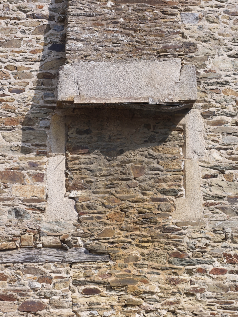 Tréguier, 12-16 rue des Perdreries (Perderies) : immeuble à logements dit "Hôtel de Coëtivy", pignon ouest, détail de la cheminée ancienne à l'étage (bâtiment détruit avant 1834, date d'établissement du cadastre).Immatriculation