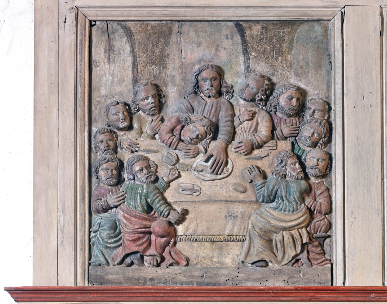 Représentation de la Cène dans un panneau en bois, sculpté et peint, installé dans la balustrade formant la clôture du choeurImmatriculation