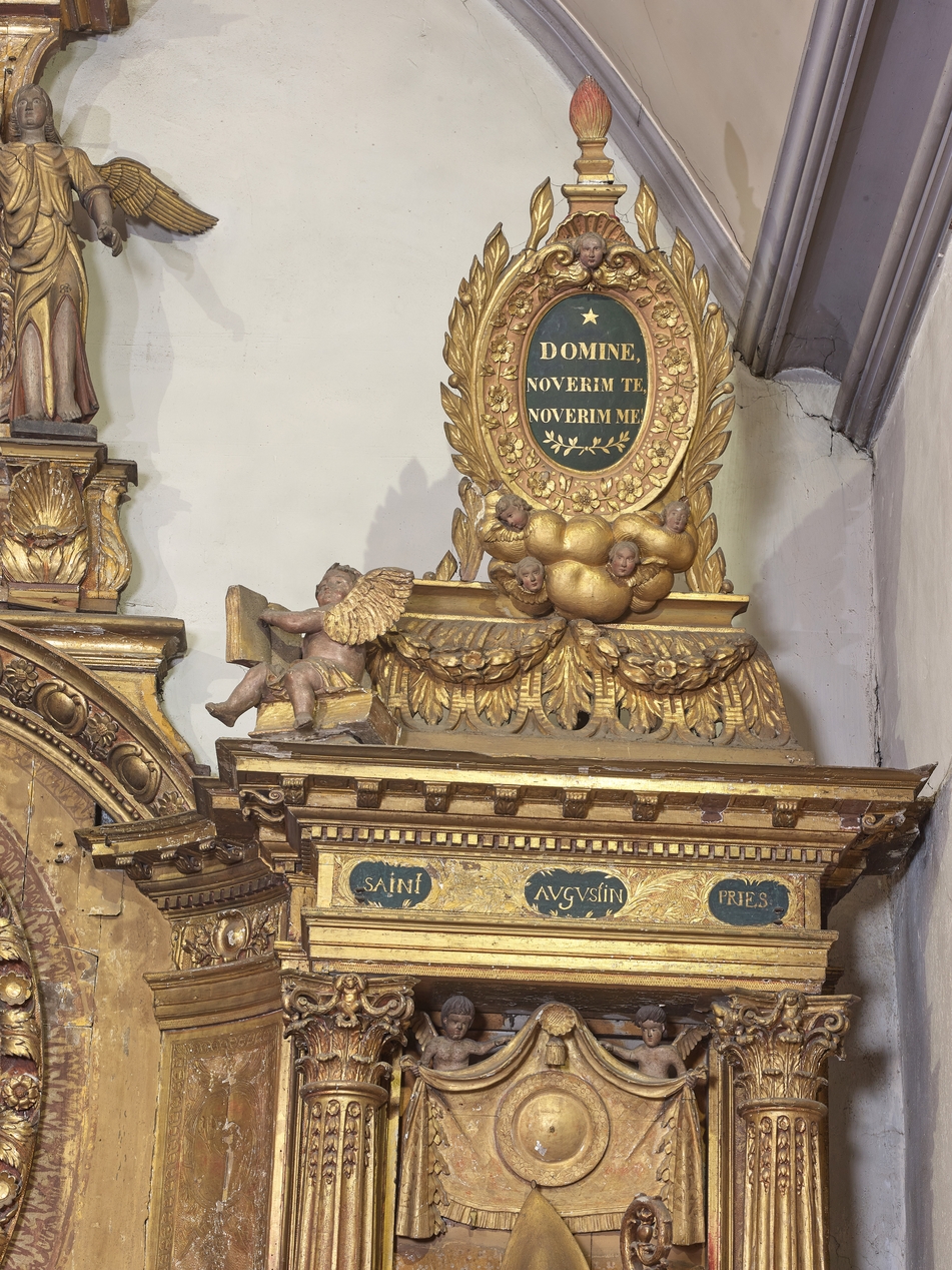 Retable. Détail de l'entablement et du couronnement orné de motifs décoratifs (médaillon, pot à feu, angelot)Immatriculation