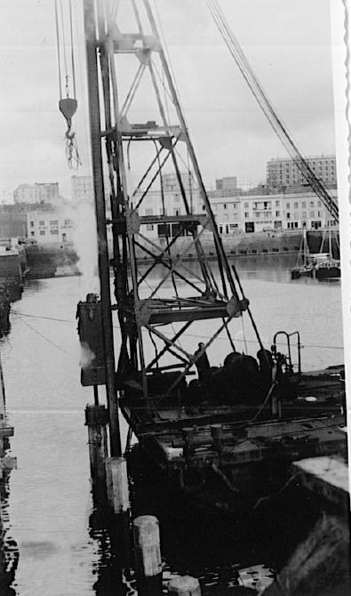 Photographie de suivi de chantier (1956) : installation des pieux par grue sur bargeImmatriculation