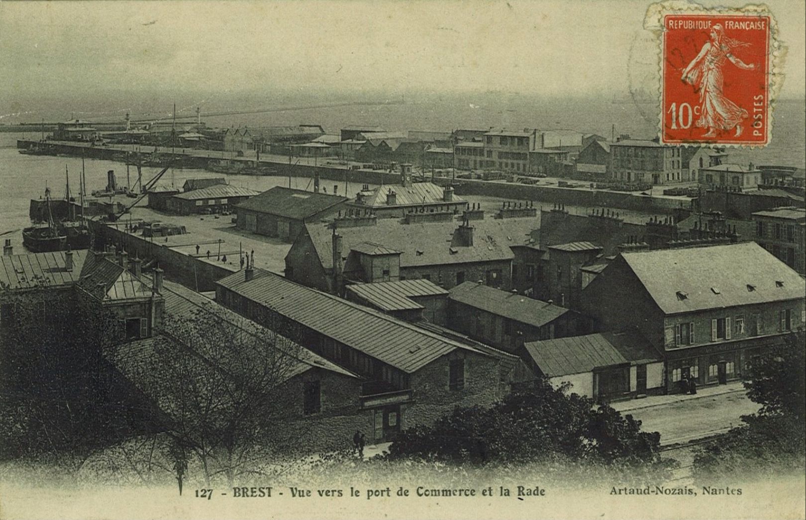 Carte postale, Brest, vue du port de commerce et la rade. Ed. Artaud-Nozais, Nantes. (coll. B.M. Brest) : bureau du port (état avant guerre)Immatriculation