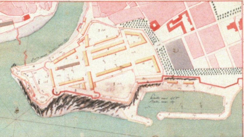Nouveau port projeté à postrain, pour le débarquement des vivres et une partie du commerce intérieur de la ville de Brest, dessin à la plume, encre de chine, encre rouge et aquarelle (23,2 x 67,5 cm), 1785 (fonds H. Destailleur)