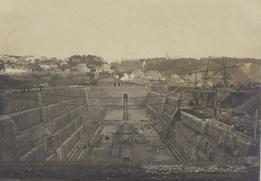Travaux de la forme de radoub n°1 : avancement des travaux, état au 31 janiver 1907 (bajoyer babord construit ; bajoyer tribord en cours de construction ; radier finalisé)Immatriculation