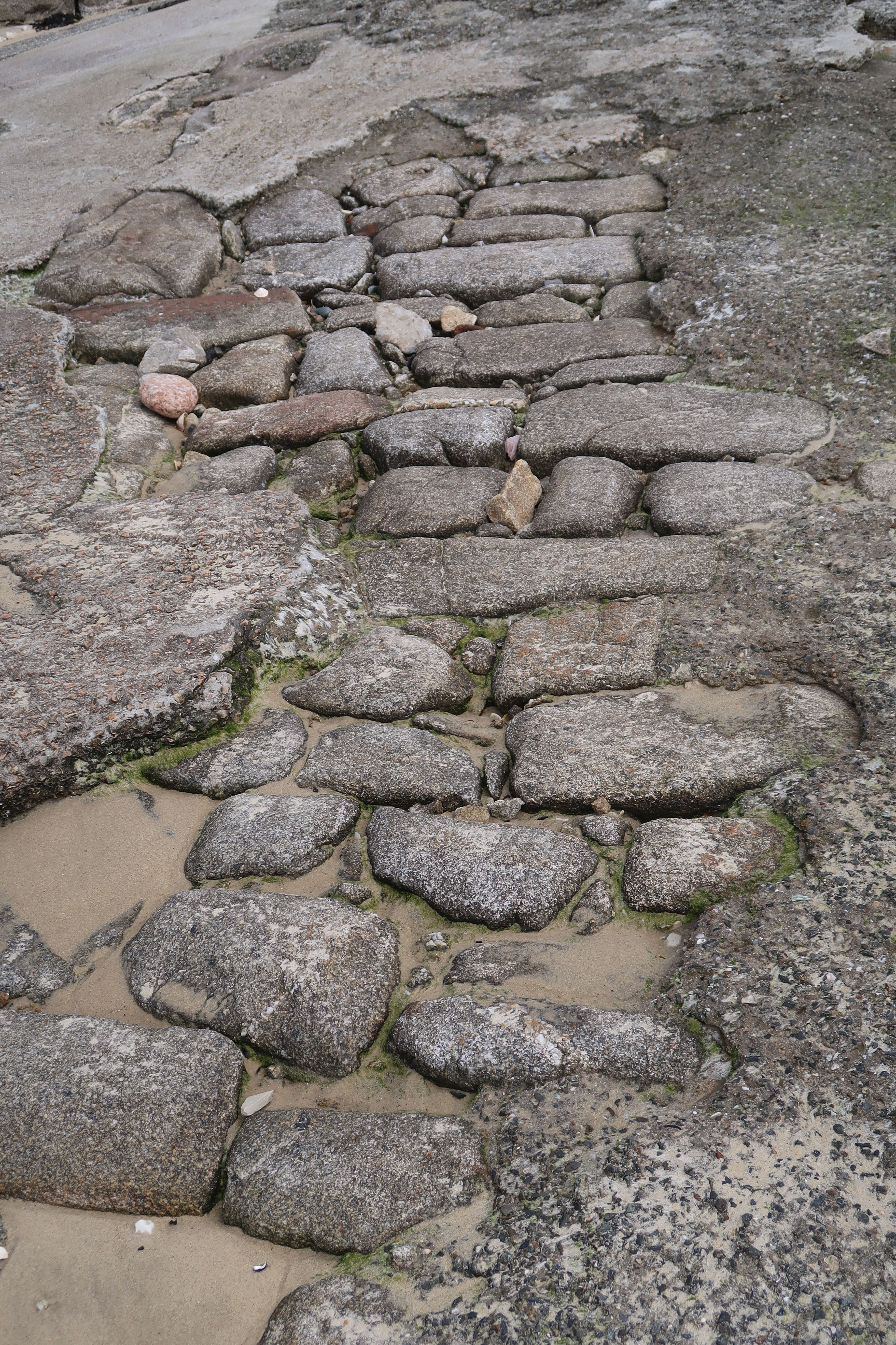 Cale située au nord de la digue, détail platelage (granite issu des rochers de l'anse et ciment)Immatriculation