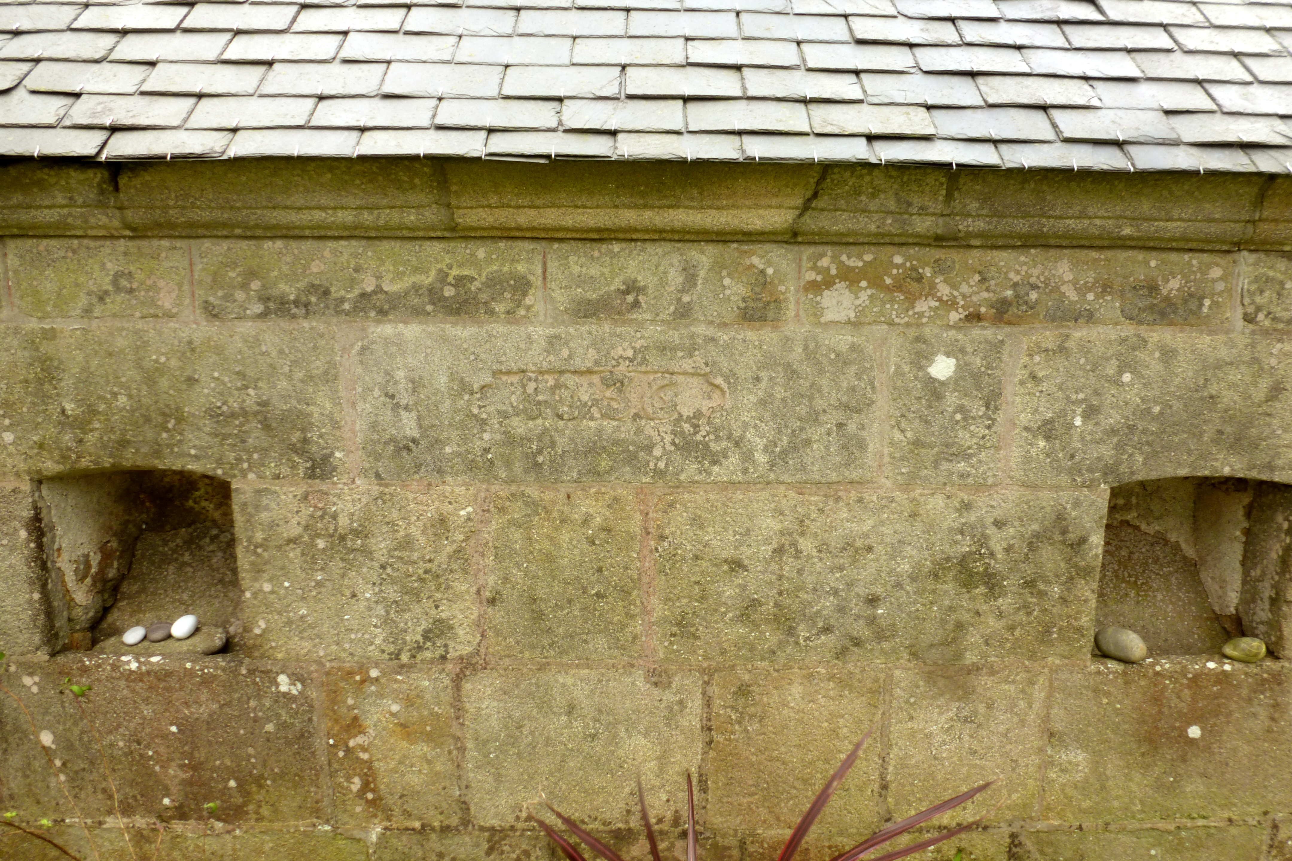 Crèches à cochons 1, élévation antérieure. Détail de la date de 1836, de l'appareillage en pierres de taille, des mangeoires et de la corniche du toit moulurée.Immatriculation