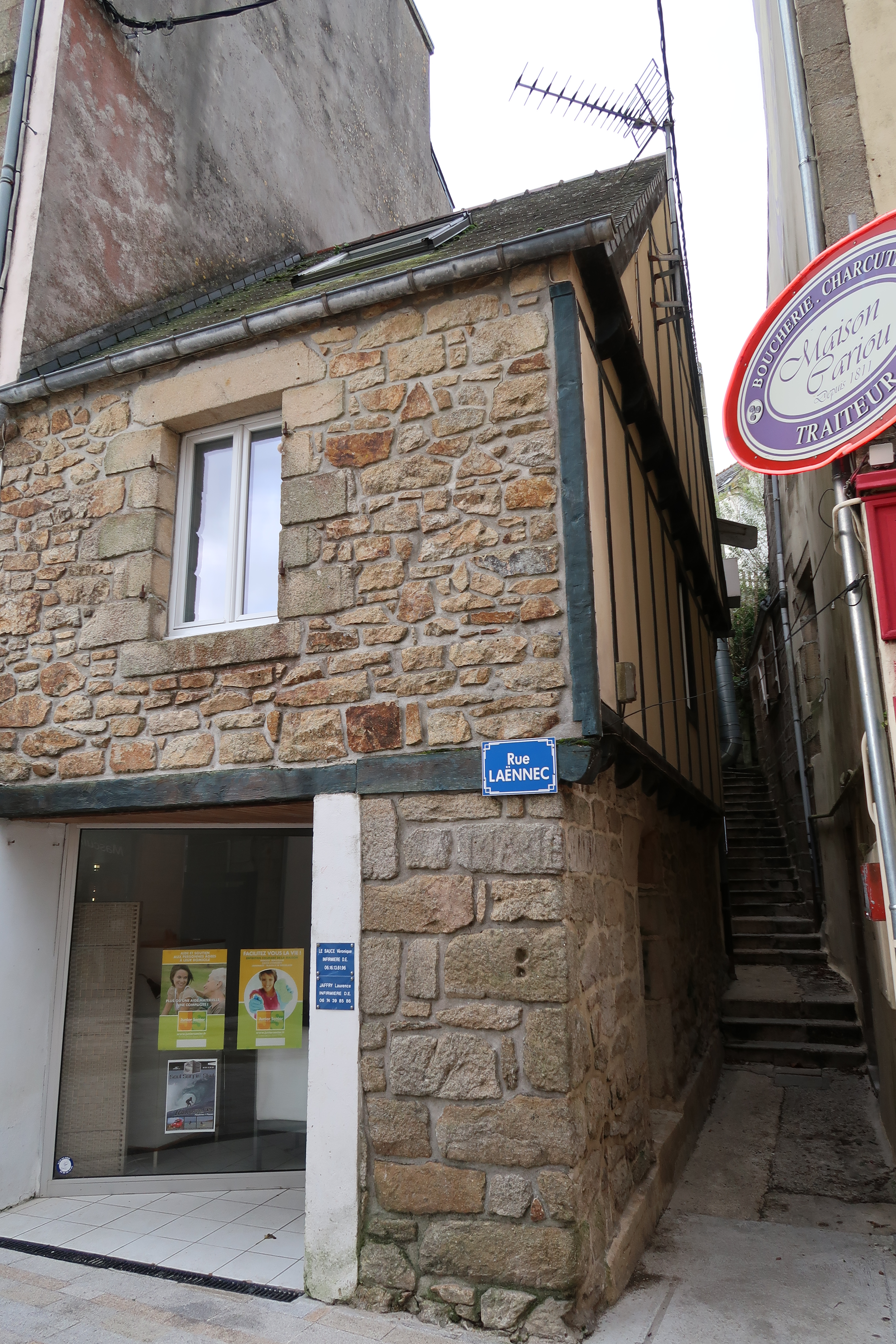 Rue Laënnec, côté ouest, maison à pans de bois au n°2 et départ de la venelle dite "de Keridreuff" menant au sommet de la colline du même nom. (2020)Immatriculation