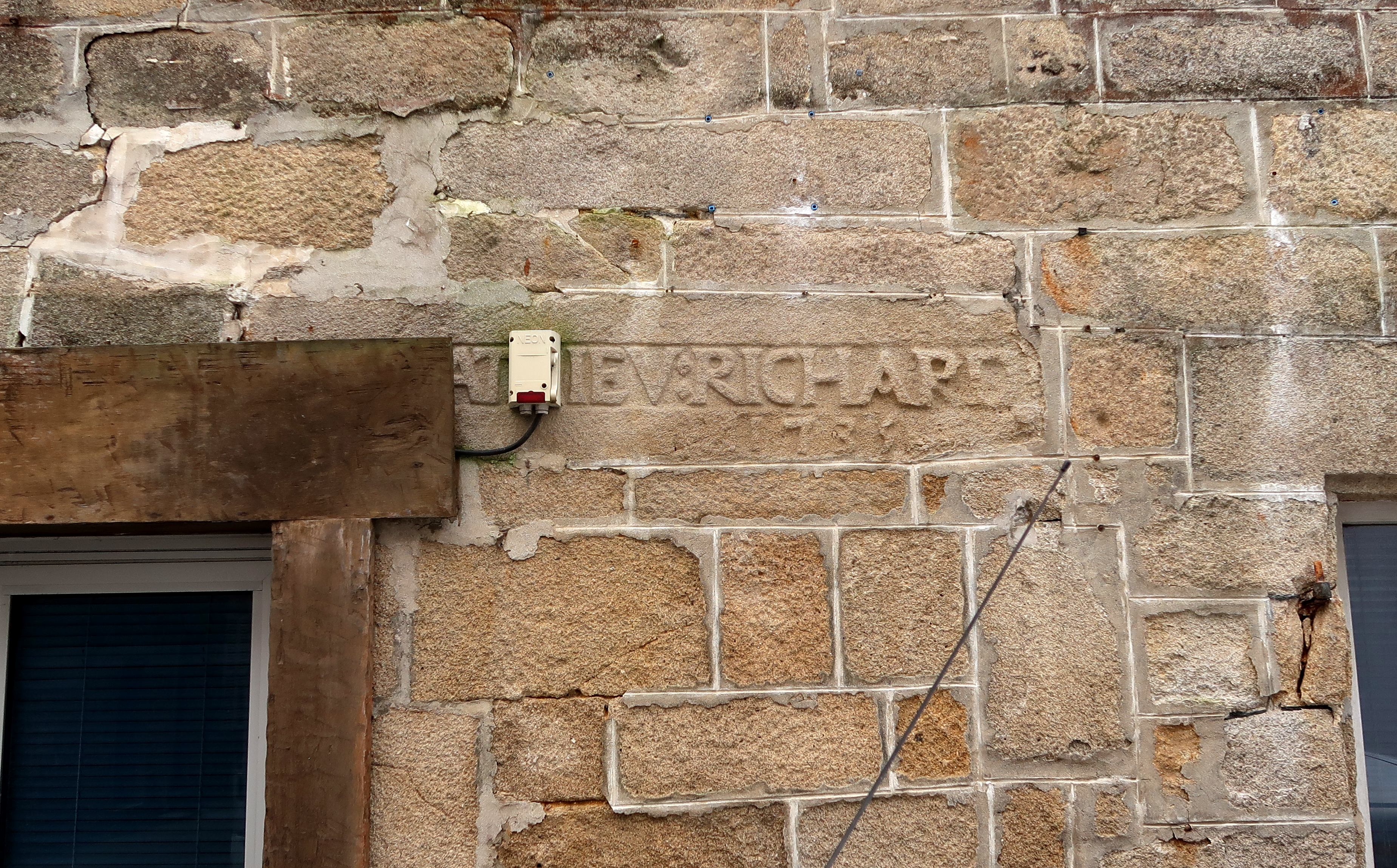 Rue Laënnec, côté ouest, maison au n°10 datée 1735, pignon est. Détail de l'inscription partiellement cachée "MATHIEV : RICHARD 1735"Immatriculation
