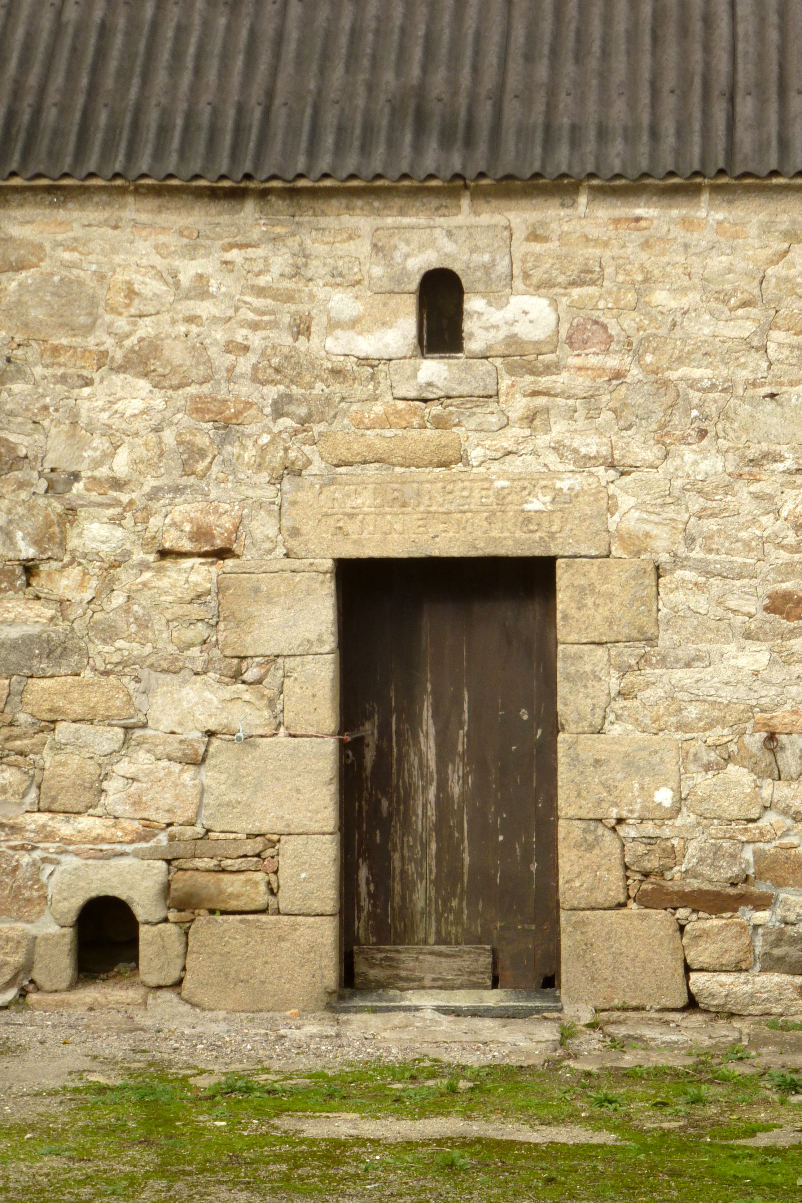 Kerguennec, ferme datée 1841, détail de la porte avec niche pour le chien et inscriptions : "ALLAIN : PERROT / ANNE : MINOU" (2020)Immatriculation