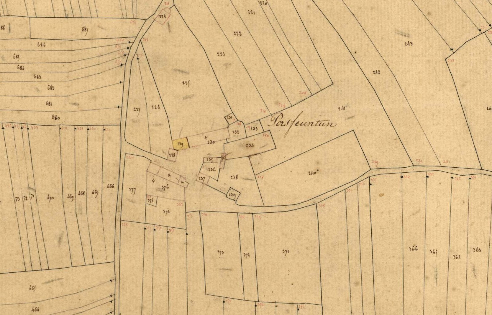 Village de Pors Feunteun, cadastre ancien de la commune historique d'Esquibien, 1837.Immatriculation