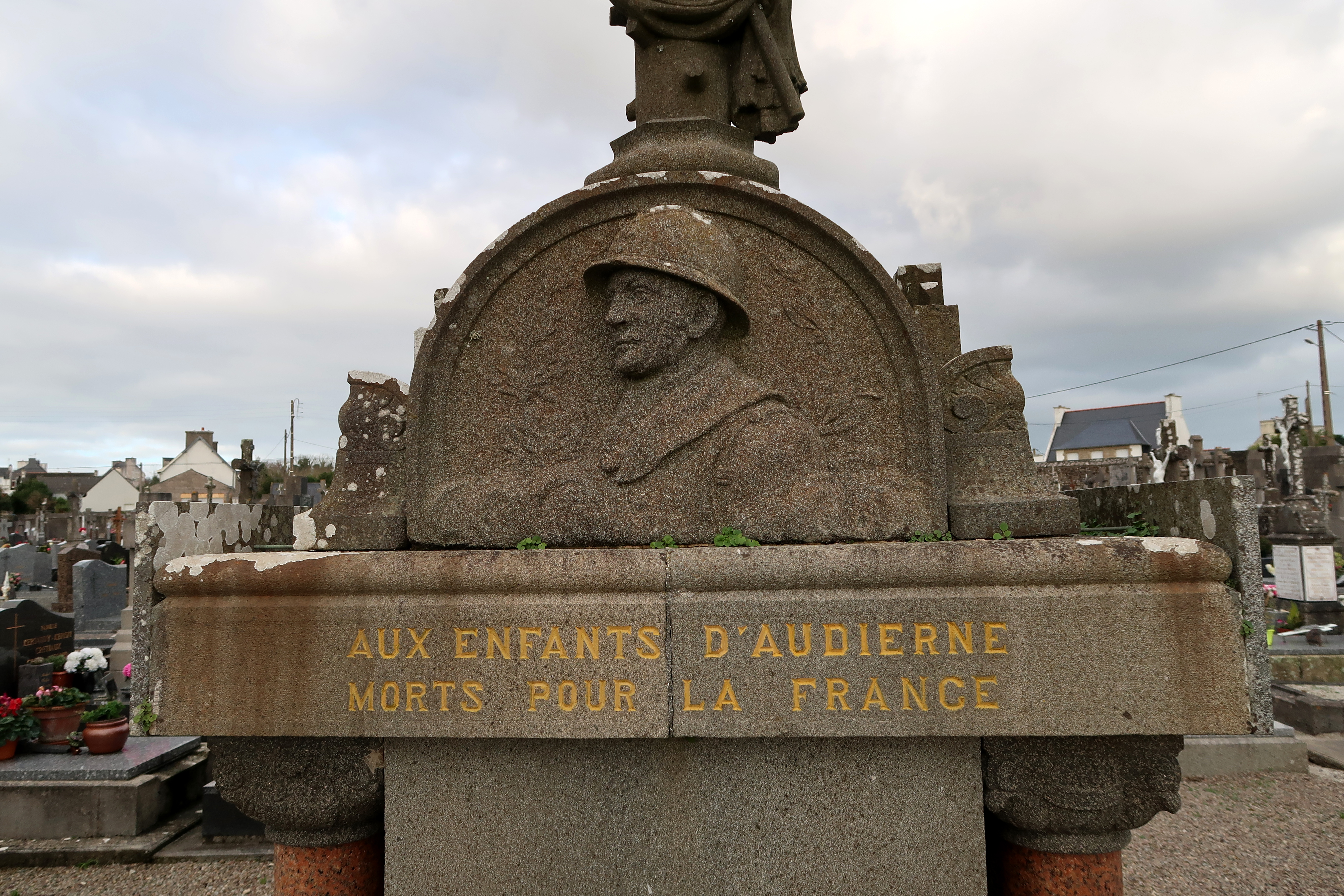 Croix du cimetière et monument aux morts, vue rapprochée du côté sud : représentation d'un soldat. (2020)Immatriculation