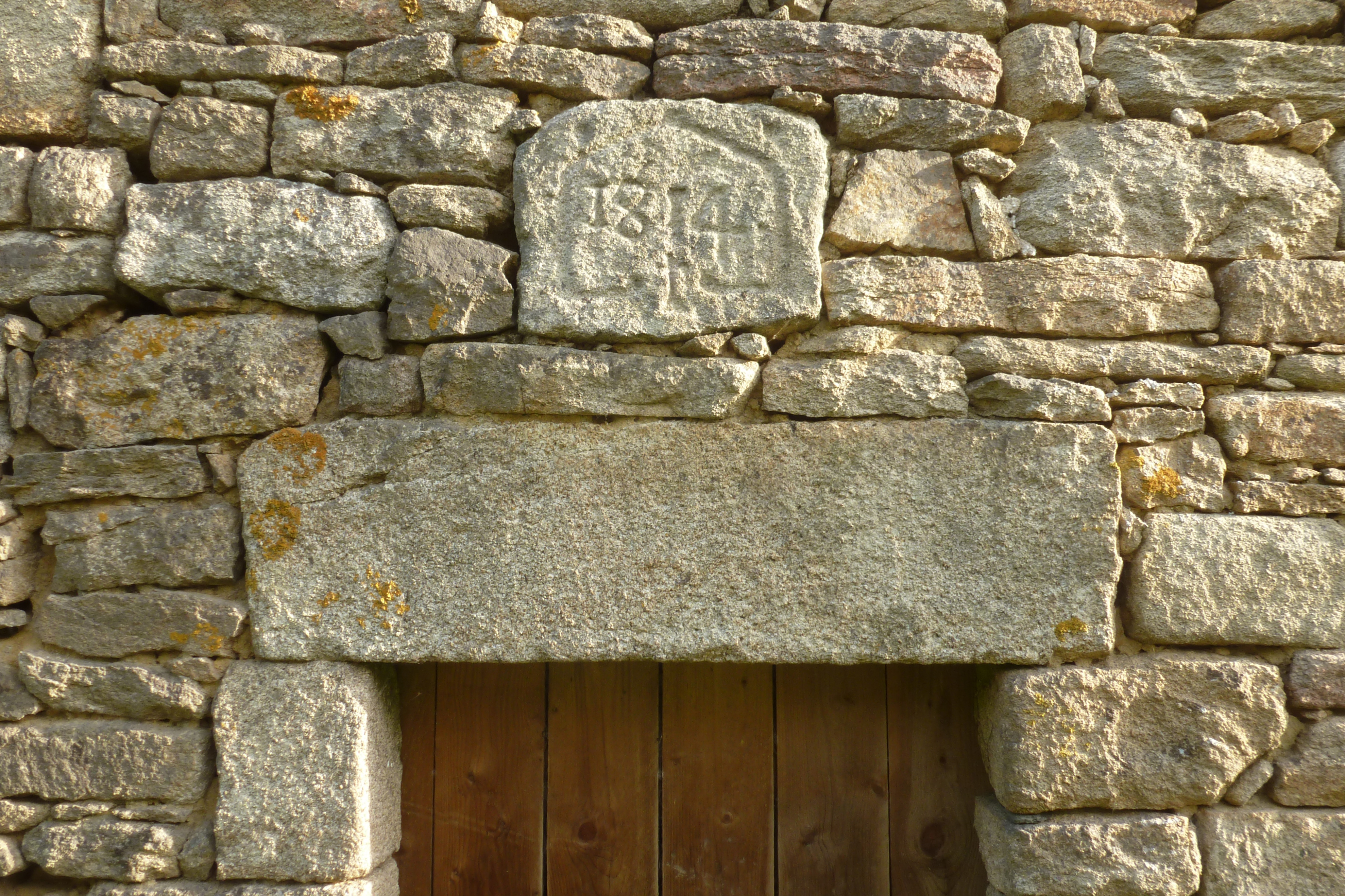 Ancien alignement maison-crèche devenu dépendance, détail de la pierre sculptée au-dessus de la porte de la crèche.Immatriculation