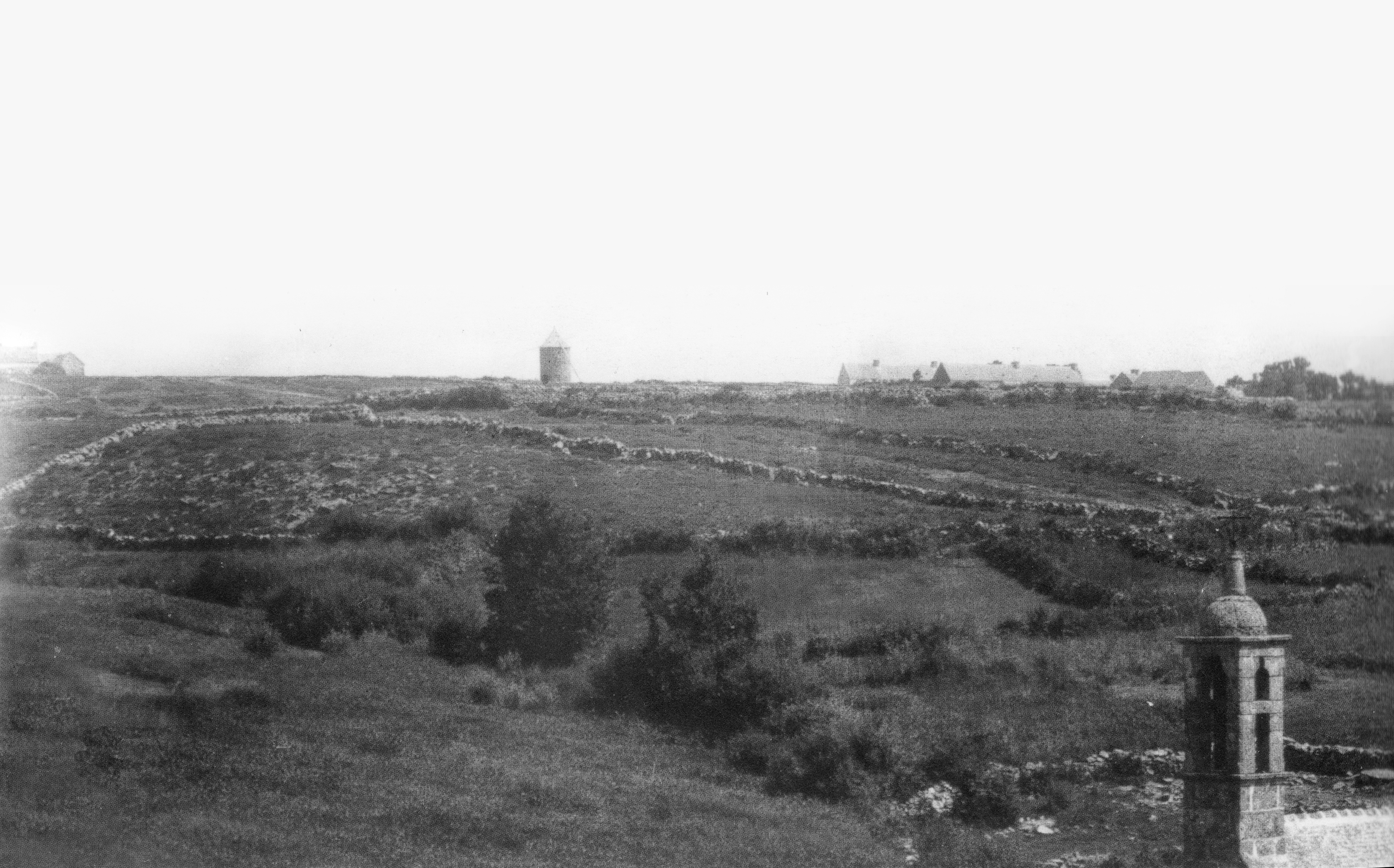Moulin de Kerglogay (détruit). Vue prise de la chapelle Saint-They dans la première moitié du 20e siècle.Immatriculation