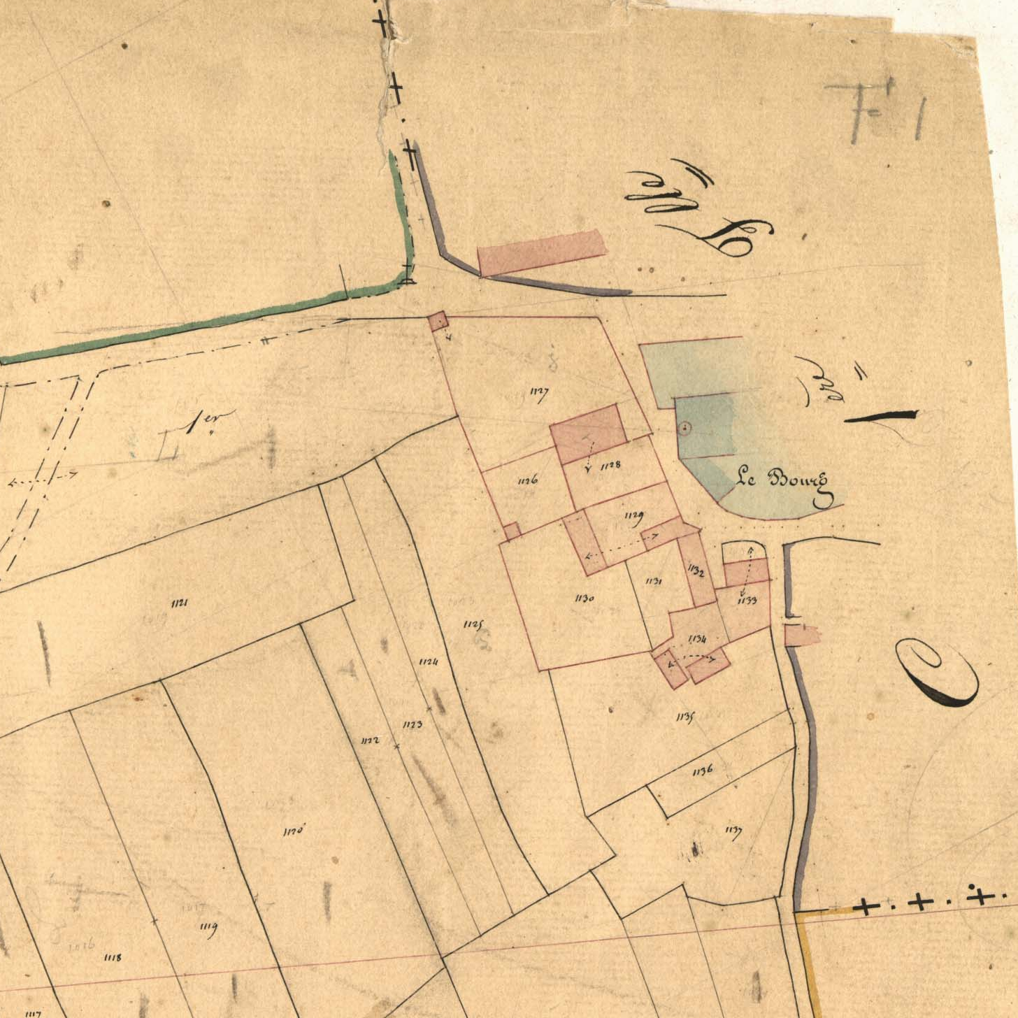 Bourg, partie ouest, Section F 1 de Guenvez du cadastre de la commune de Plouhinec, 1836.Immatriculation