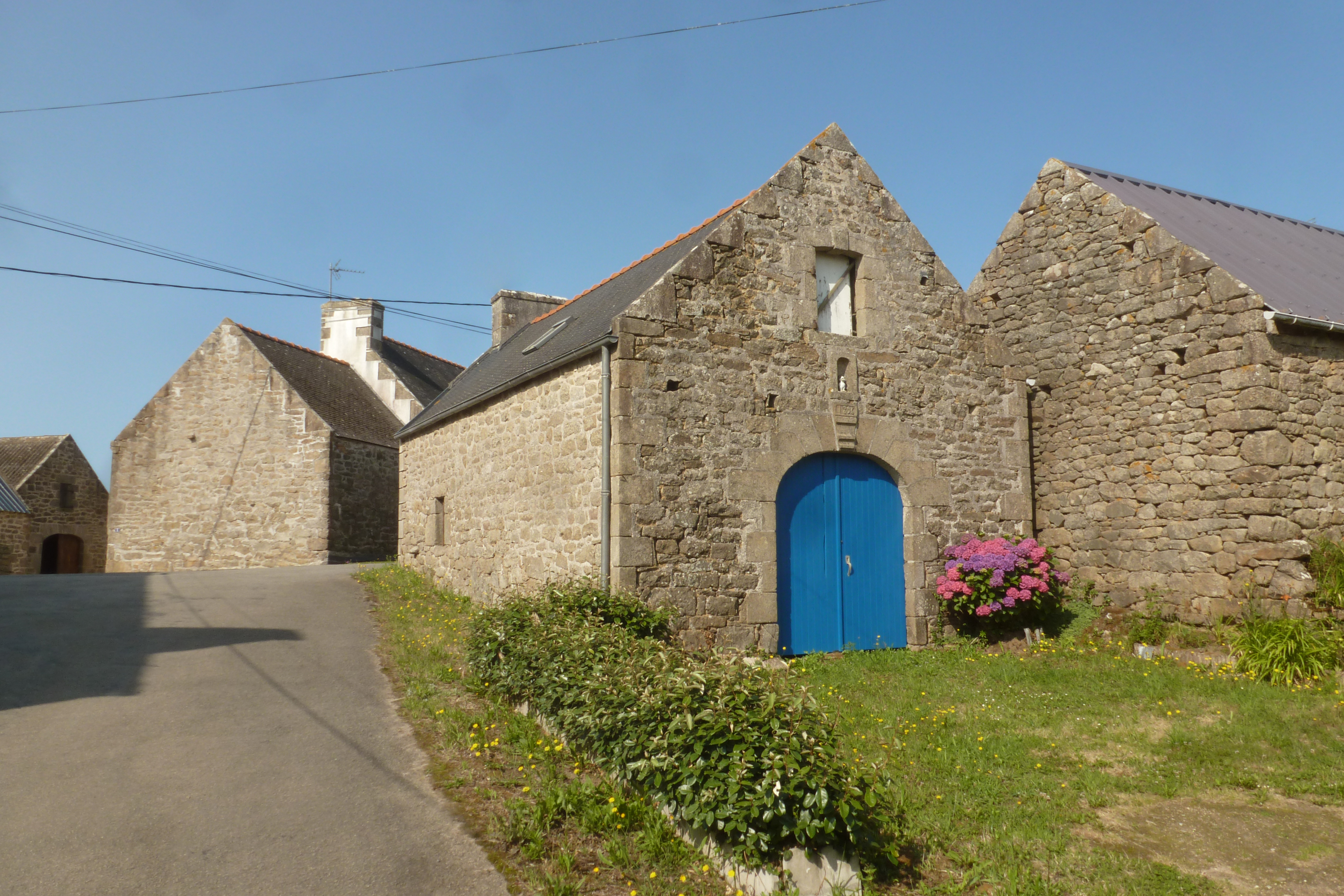 Perros, grange datée 1896, vue générale prise du nord. Présence d'une niche à saint au-dessus de la porte charretière.Immatriculation