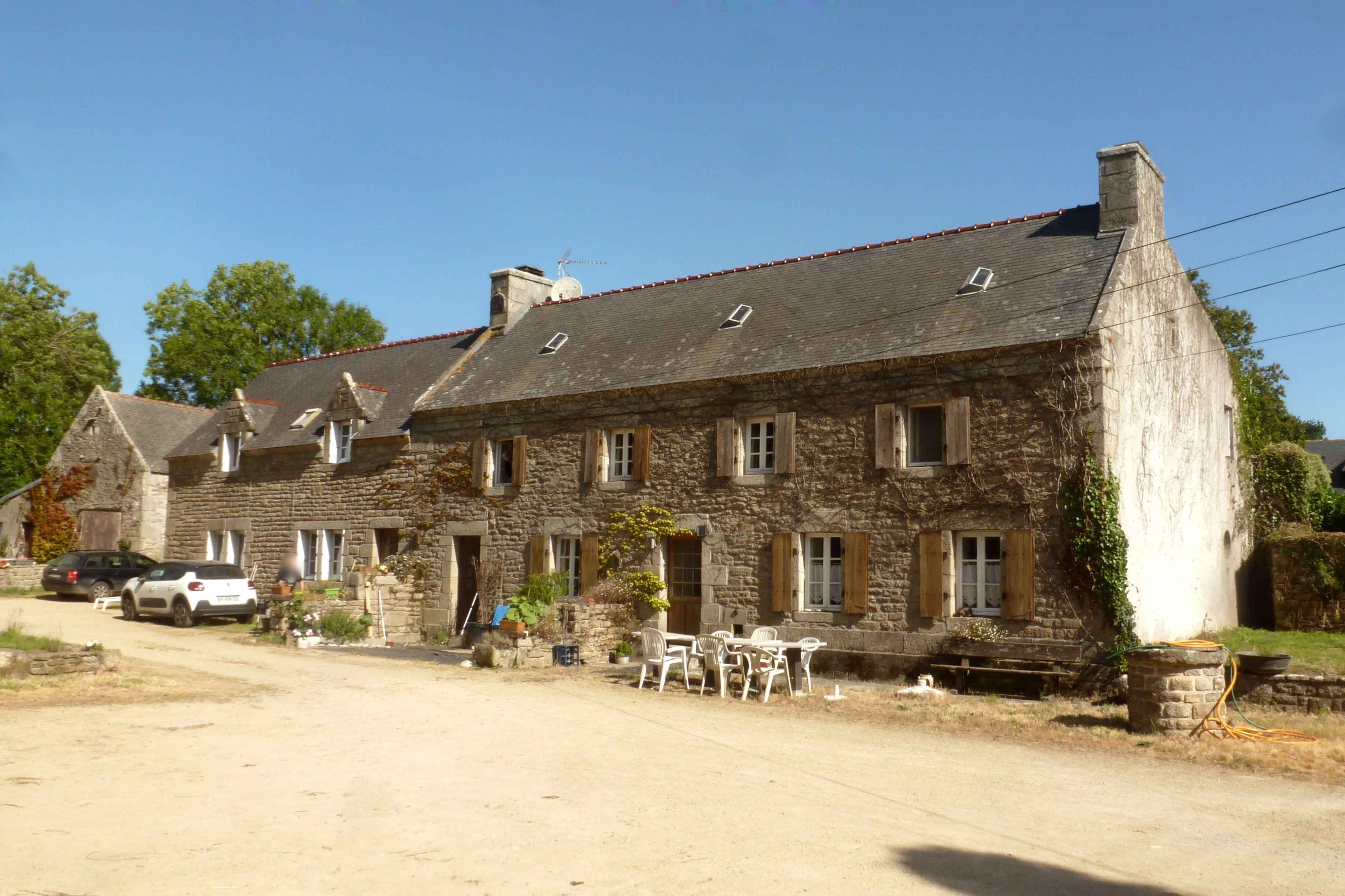 Lesvoualc'h, ferme 2, élévation antérieure de l'alignement principal. (2020) Suppression de l'enduit.Immatriculation