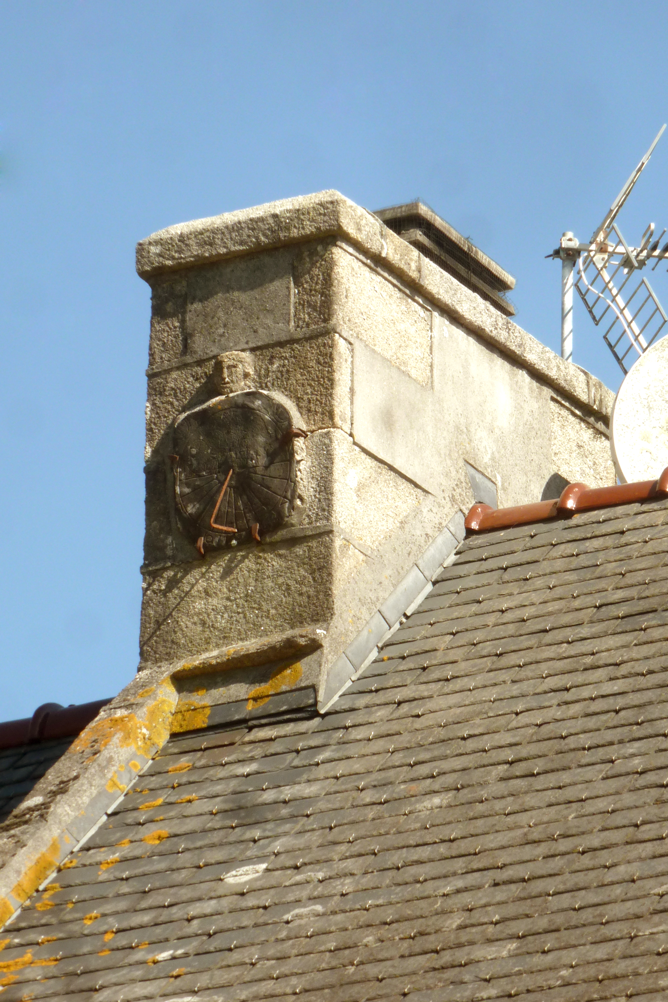 Lesvoualc'h, ferme 2, détail de la souche de cheminée ouest du logis et cadran solaire surmonté d'une sculpture de visage.Immatriculation