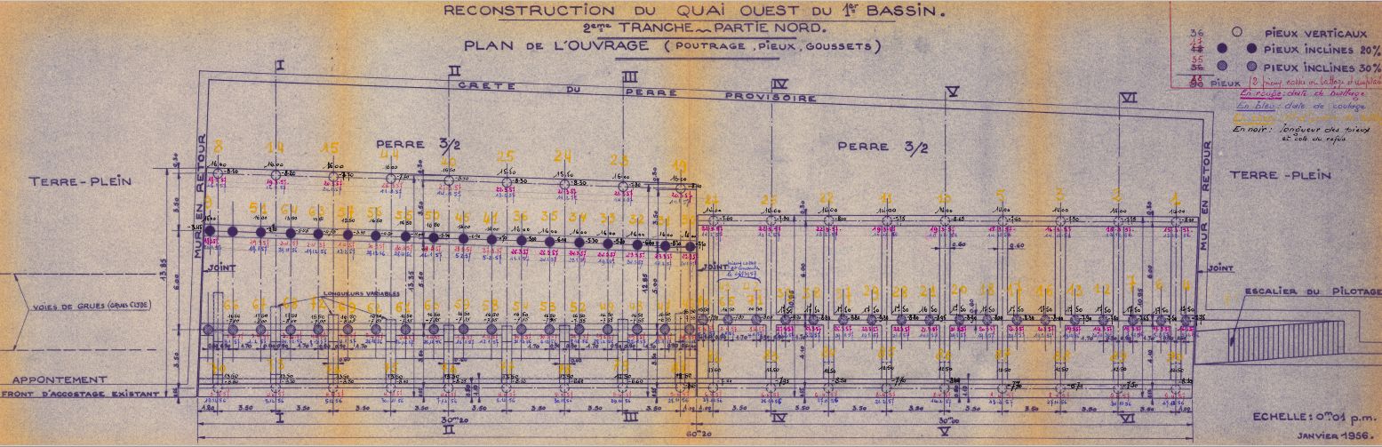 Reconstruction du quai ouest 1er bassin, 2e tranche partie nord, plan de l'ouvrage, poutrage, pieux, goussetsImmatriculation