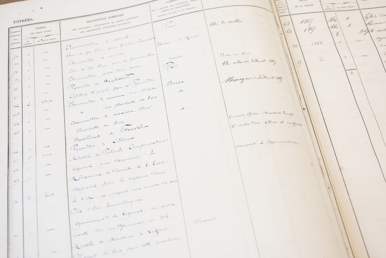 Page du catalogue général du cabinet de physique et de chimie et collections d'histoire naturelleImmatriculation