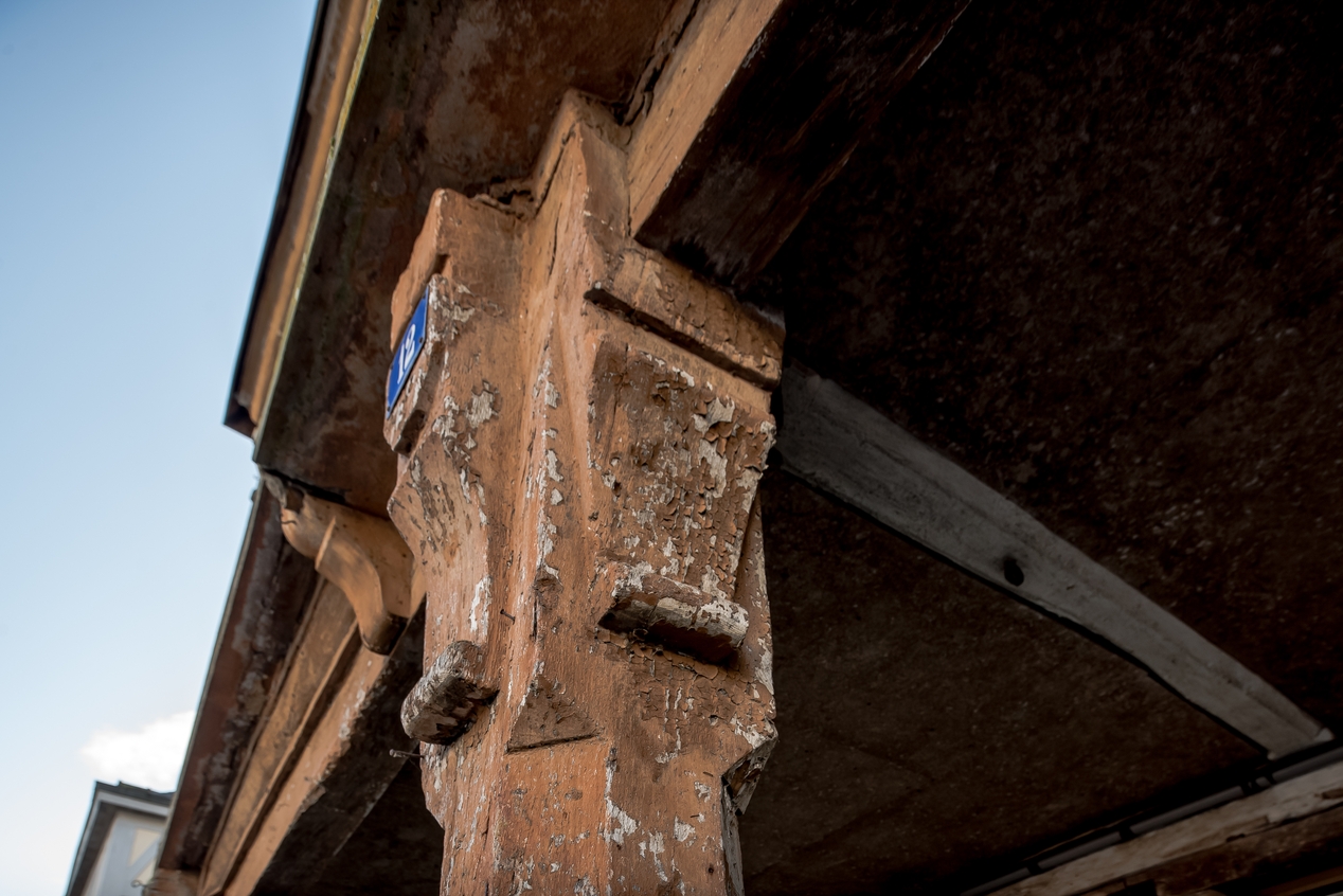 Détail du décor porté sur les poteaux du porcheImmatriculation