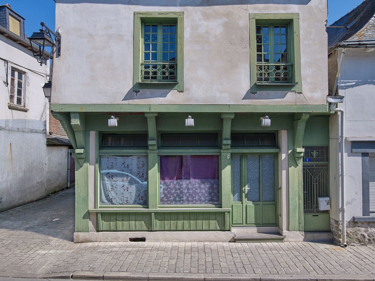 Façade de la rue d'Anjou dont le rez-de-chaussée a été fortement remanié et le pan de bois de l'étage occultéImmatriculation