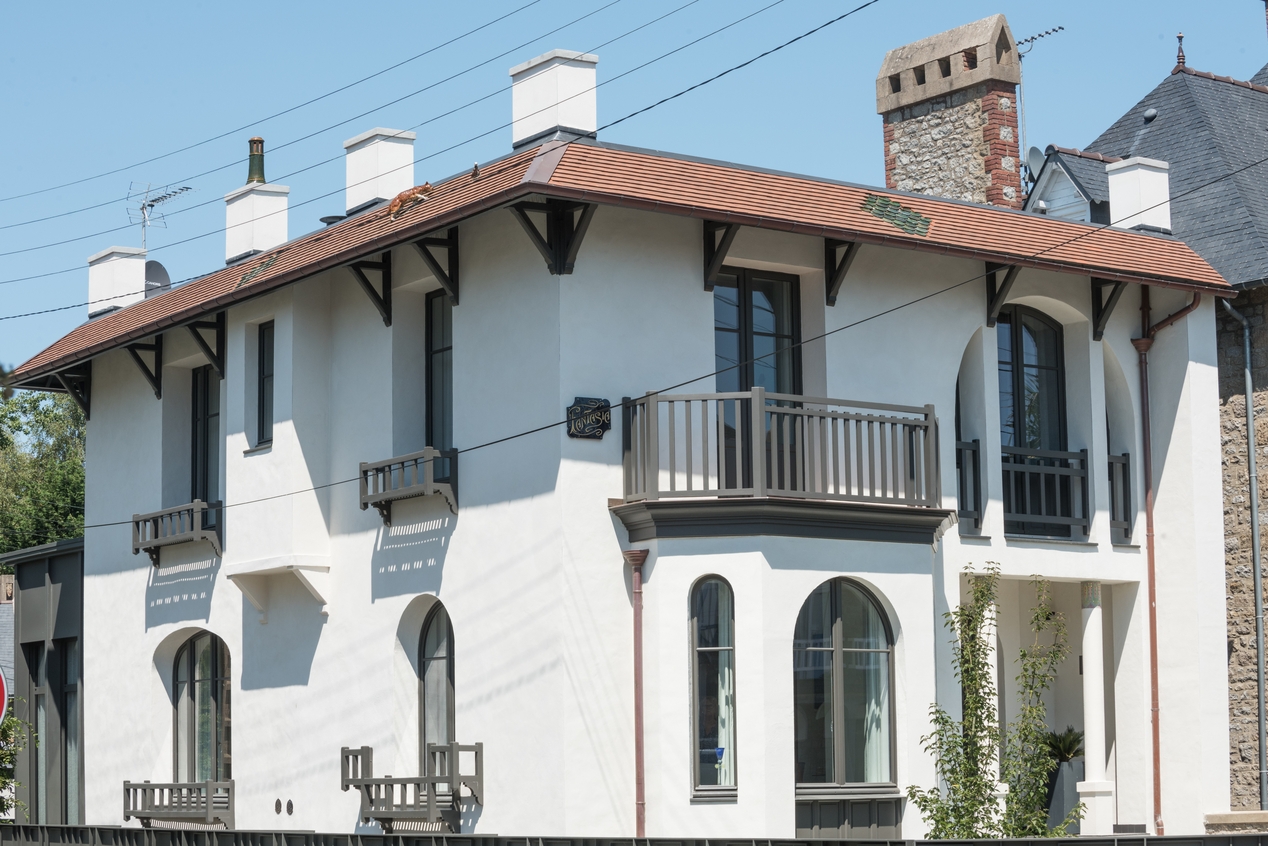 Vue prise de trois quart, style art déco, état après restaurationImmatriculation