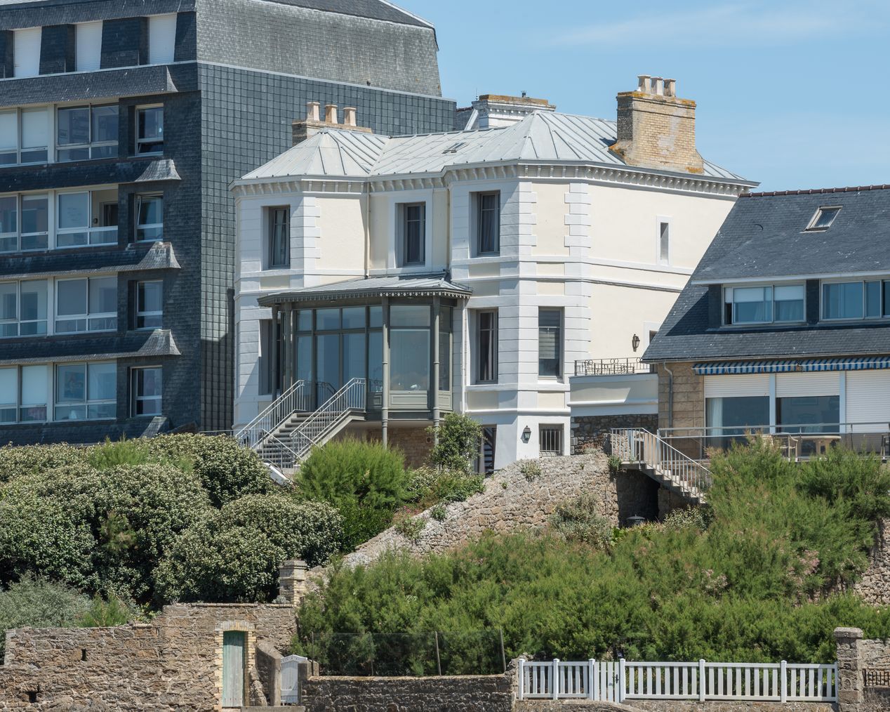 Maison de villégiature, Vue générale avec les toits en zinc à l'anglaise et la façade sud-ouest dotée de bow-windowsImmatriculation