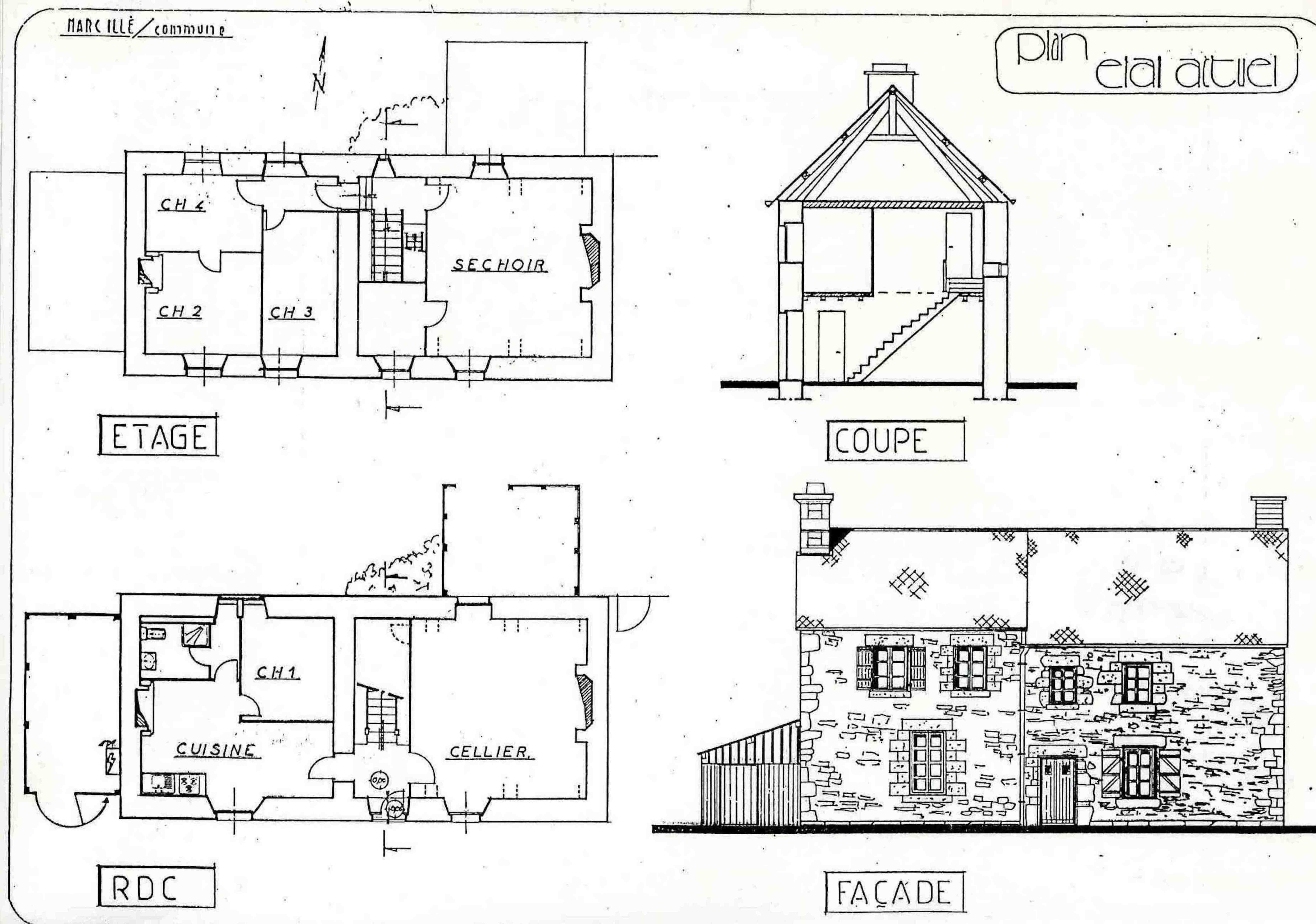 Plans pour réhabilitation de l'ancien presbytère (1994) : élévation de la façade sud, niveaux et coupeImmatriculation