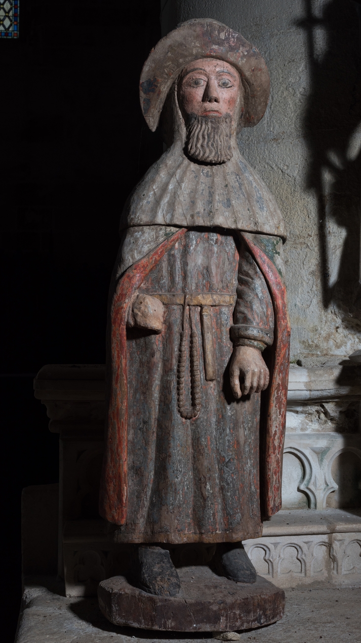 Vue générale : statue d'un pèlerin.Immatriculation