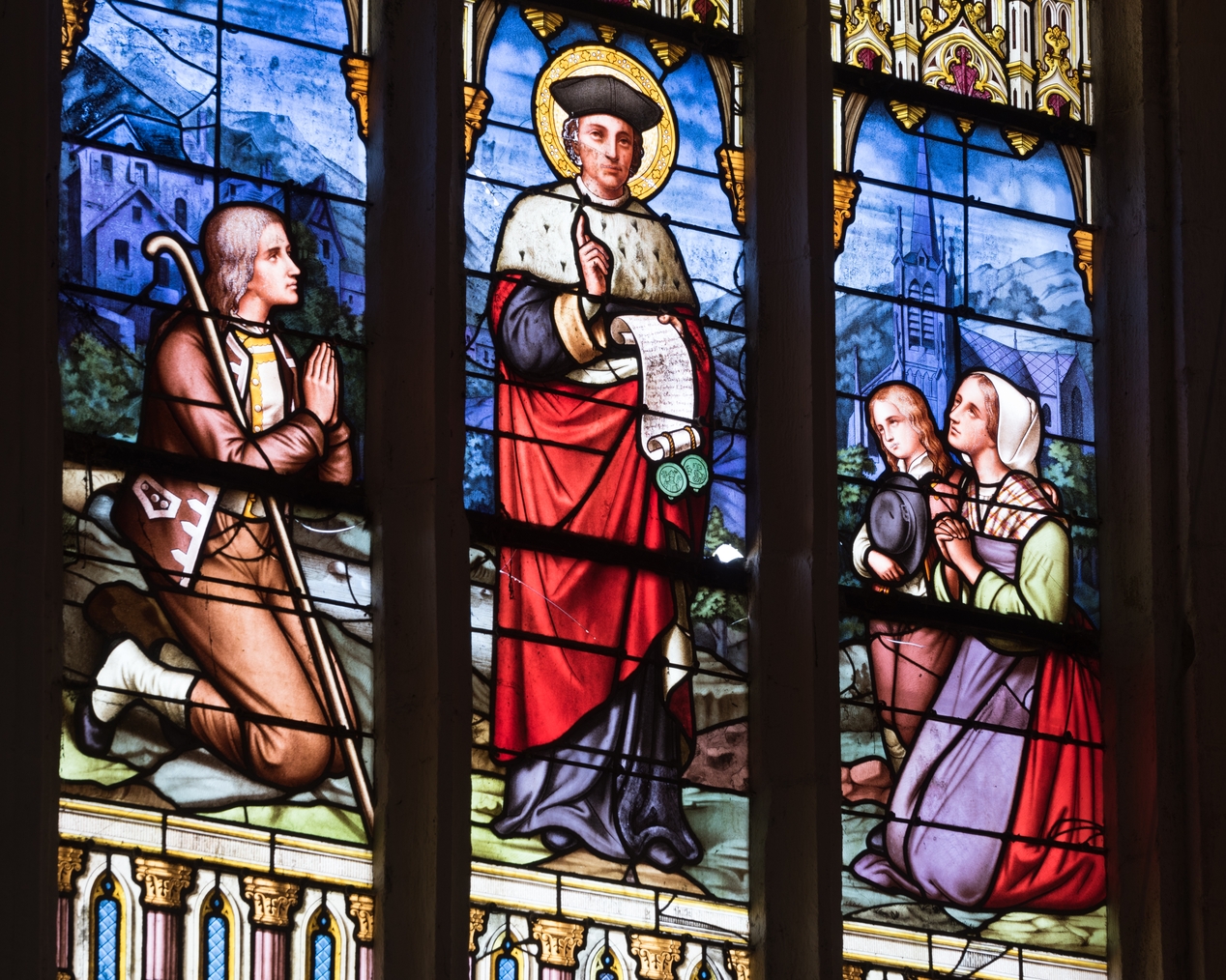 Vue de détail (verrière de la baie 7) : une famille de paysans en prière devant saint Yves.Immatriculation