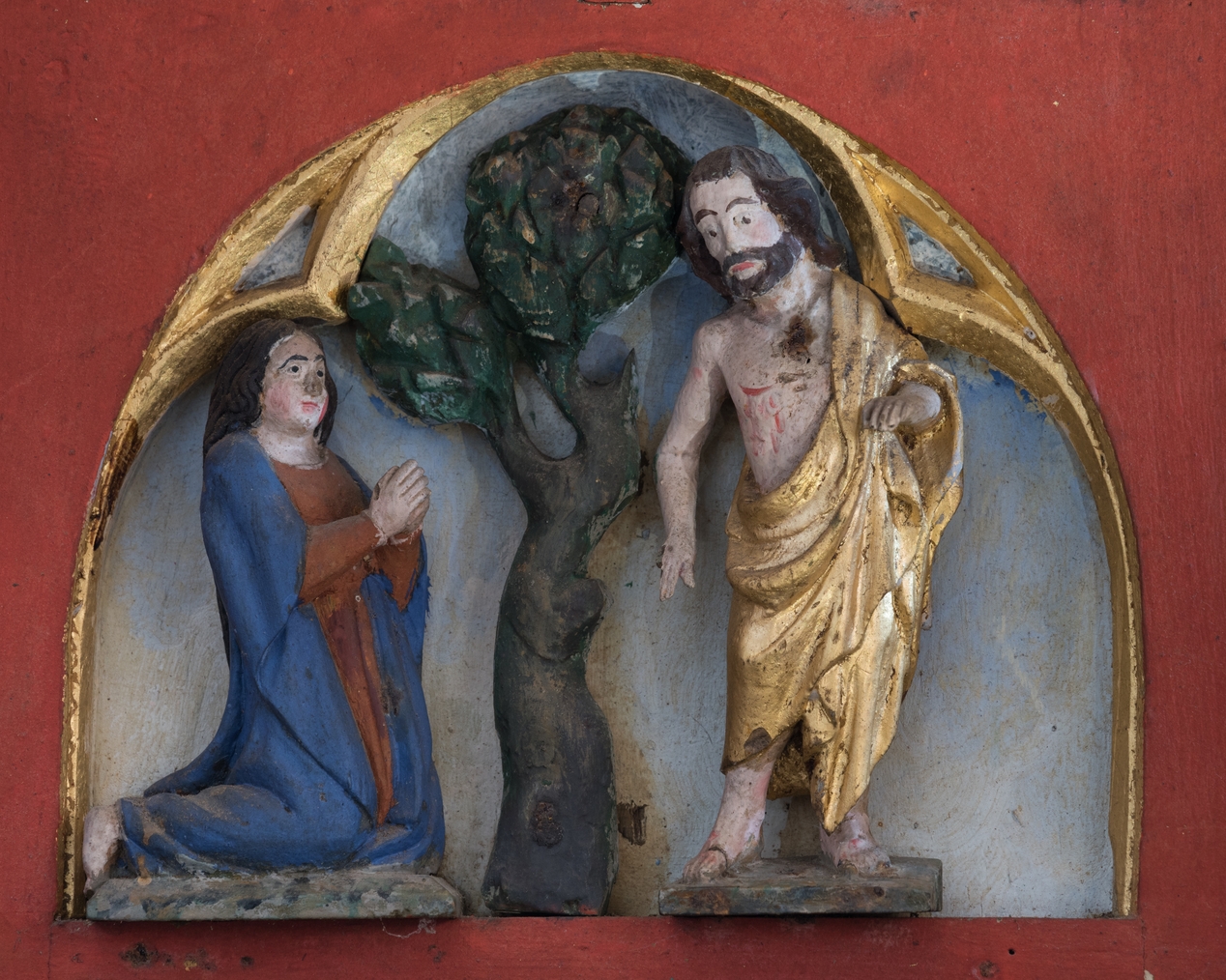 Détail d'une scène de la Vierge ouvrante : noli me tangere (apparition du Christ à Marie Madeleine).Immatriculation