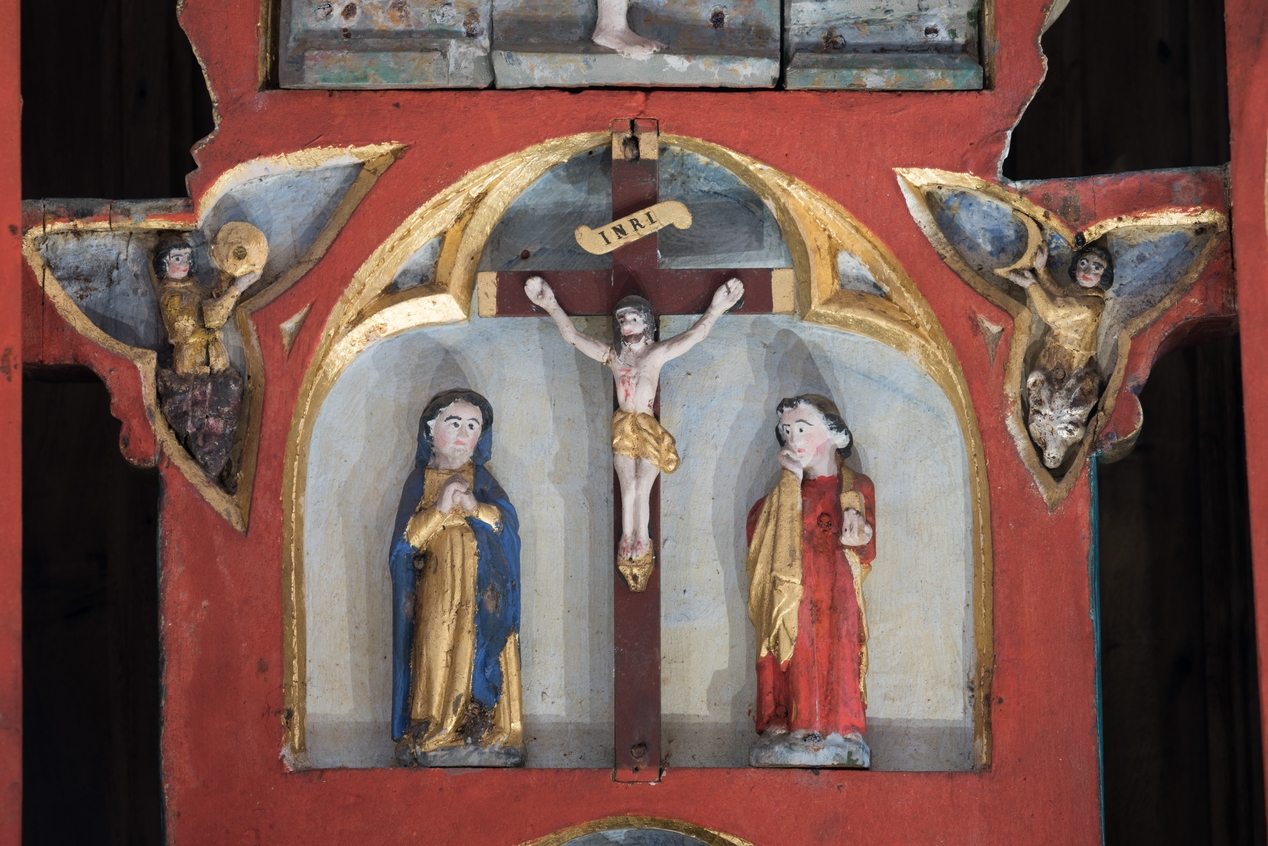 Détail d'une scène de la Vierge ouvrante : Crucifixion.Immatriculation