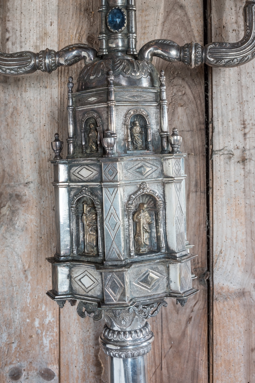 Vue de détail : noeud architecturé d'une croix de procession.Immatriculation