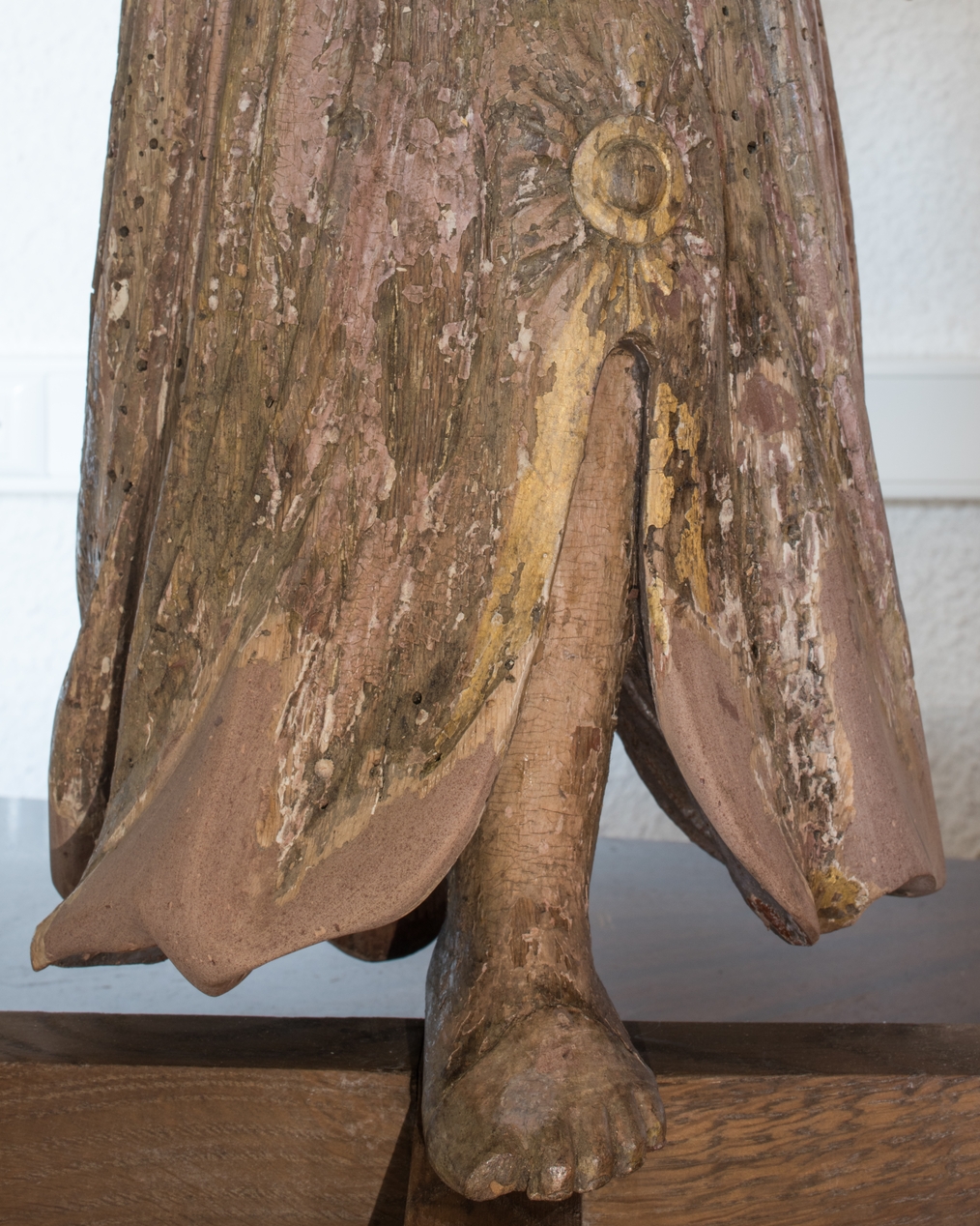 Vue de détail : partie inférieure de la tunique d'une statue d'ange pyrophore.Immatriculation