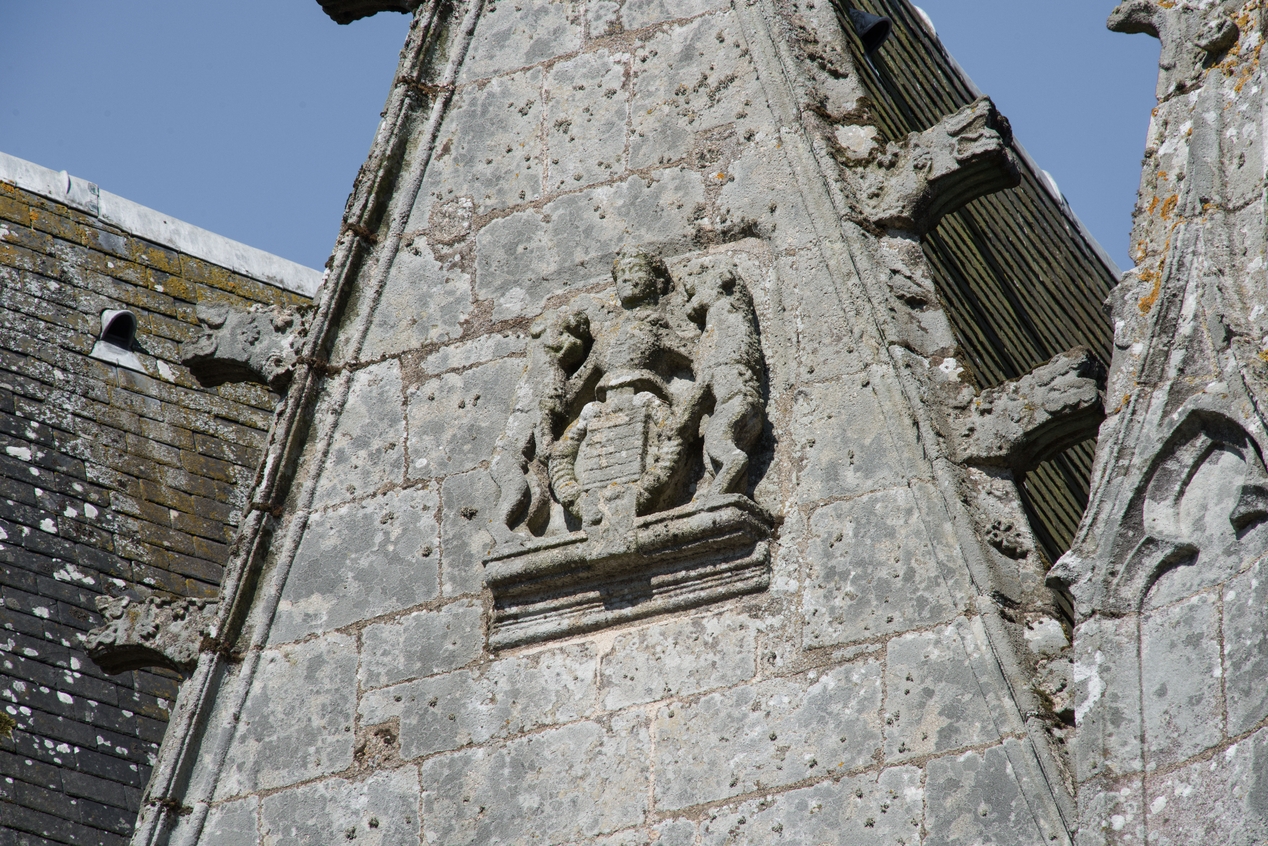 Vue de détail : armoiries sur un des pignons du chevet.Immatriculation