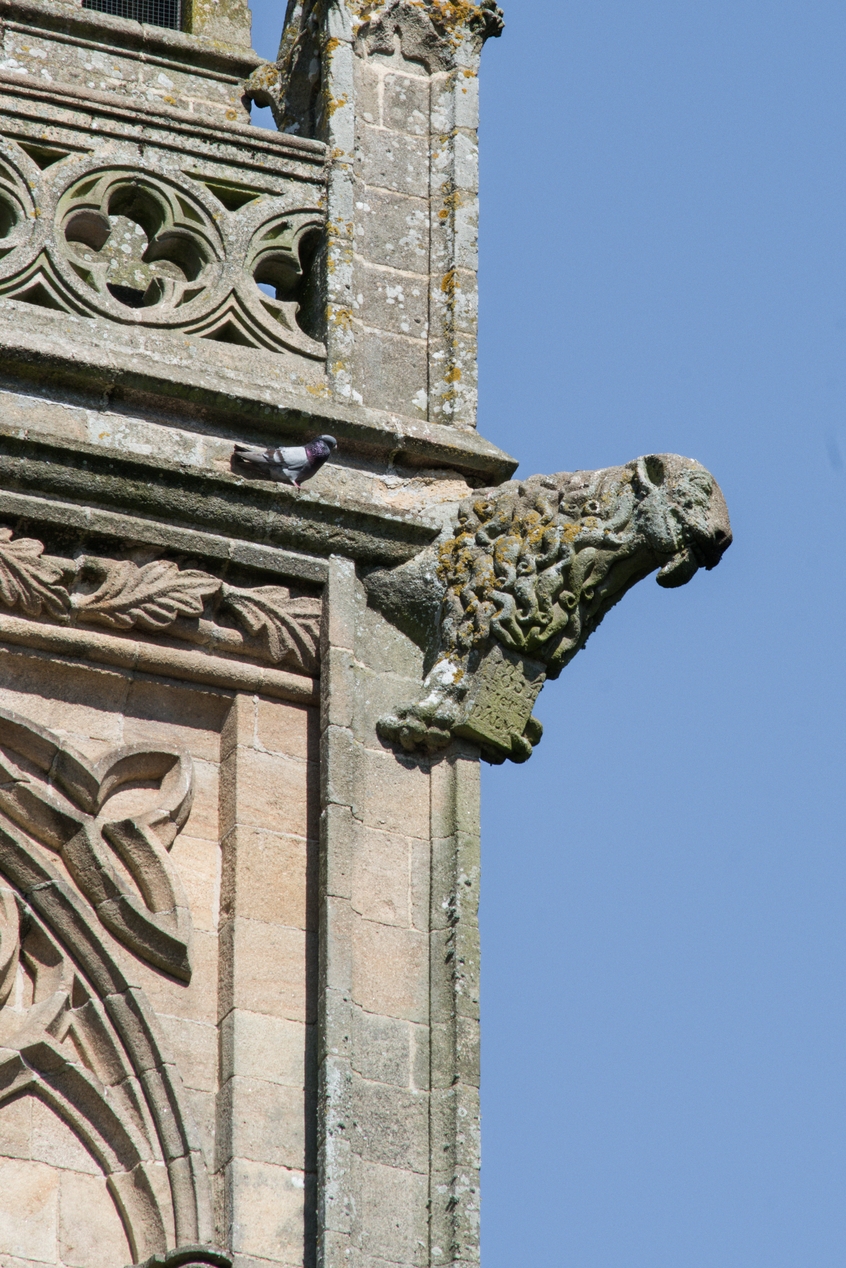 Vue de détail : gargouille sur le pilastre cornier nord-est du clocher, représentant le lion de saint Marc.Immatriculation
