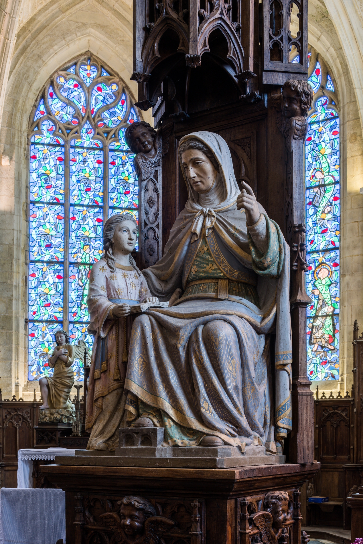 Vue d'ensemble : groupe sculpté représentant sainte Anne et Marie ou l'éducation de la Vierge.Immatriculation